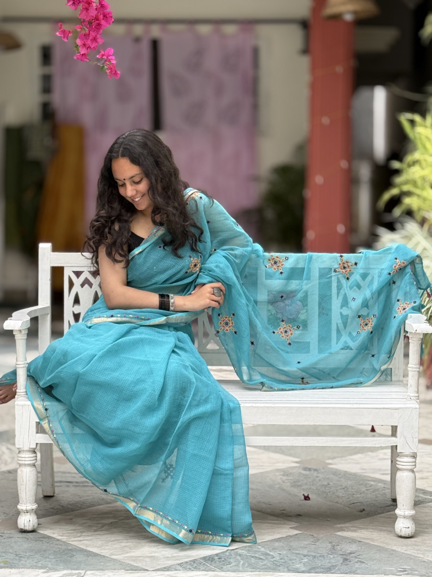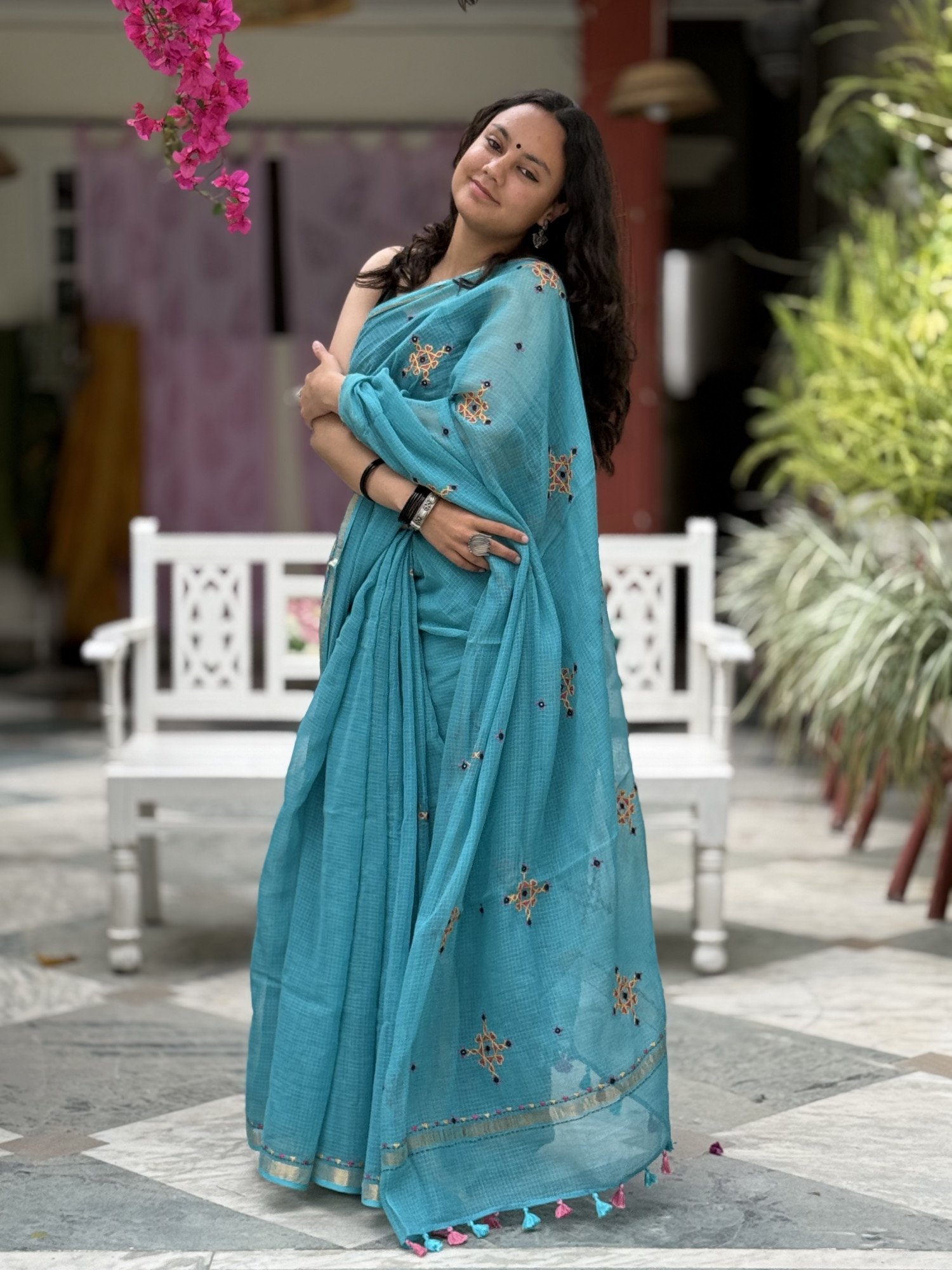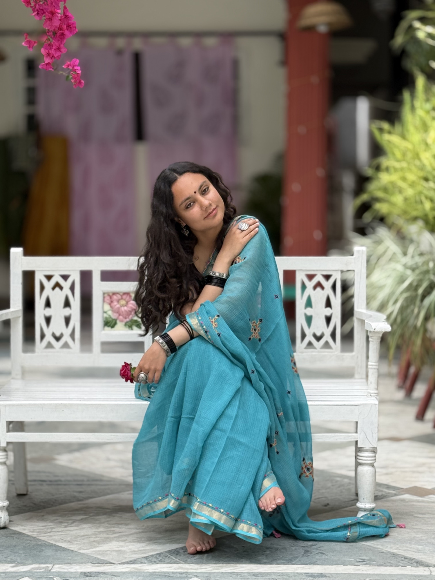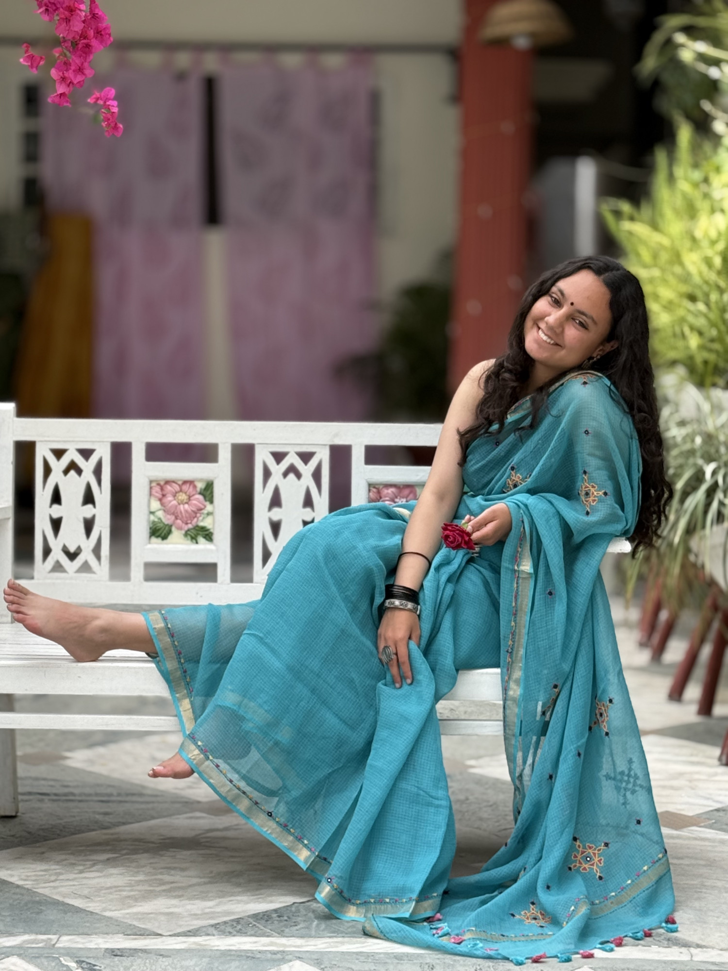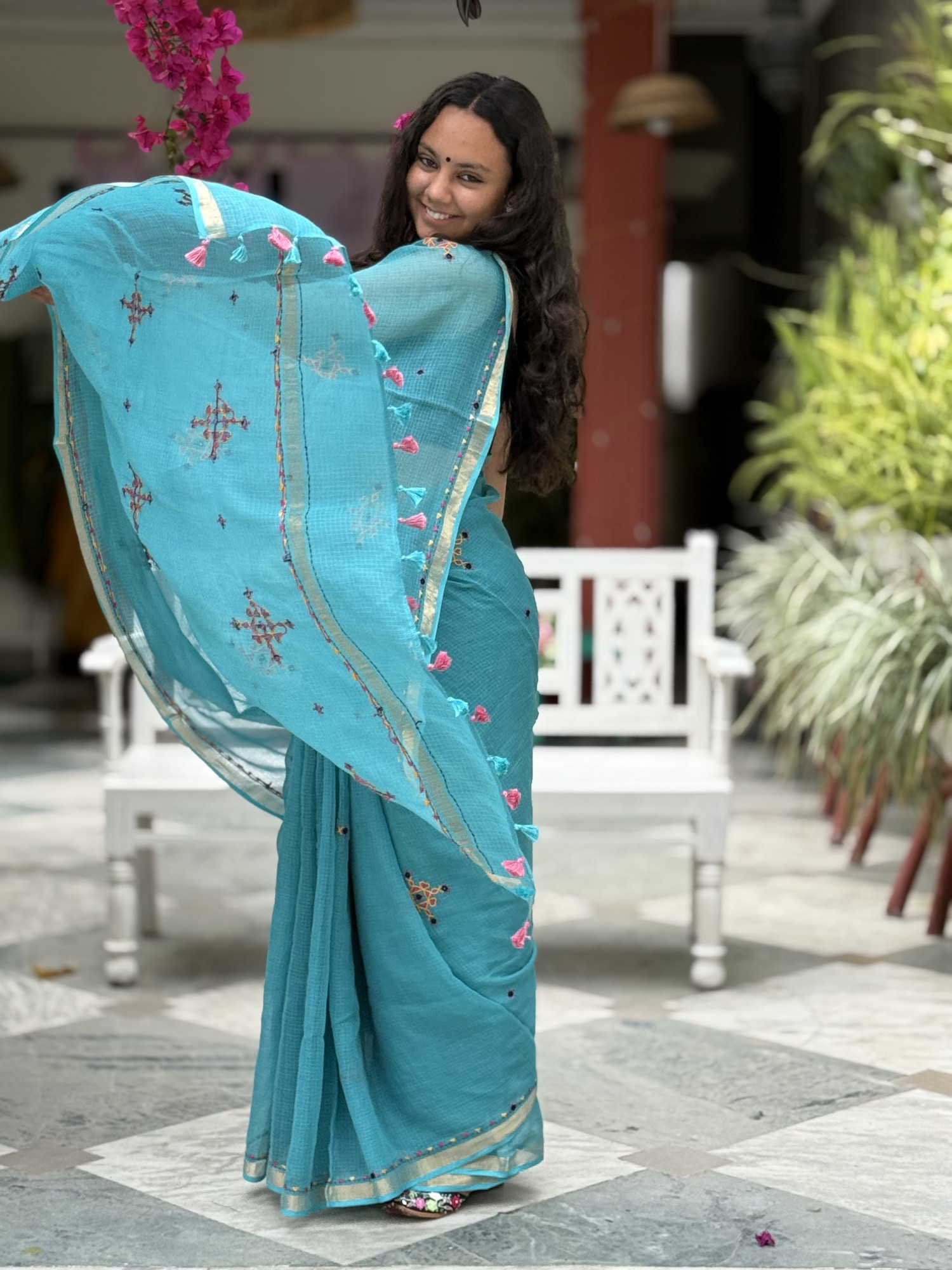 AQUA Kota cotton hand embroidery sari, with a zari woven border, accessorised with tassels.