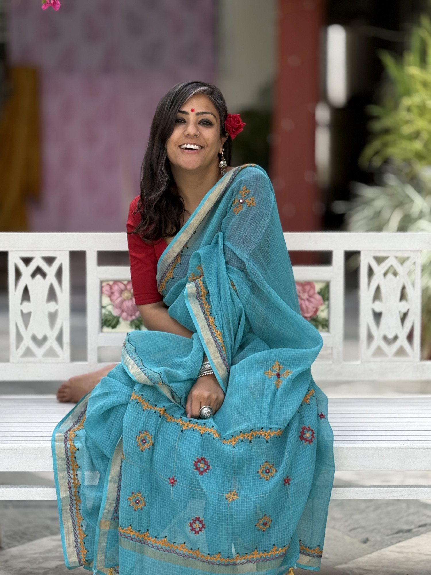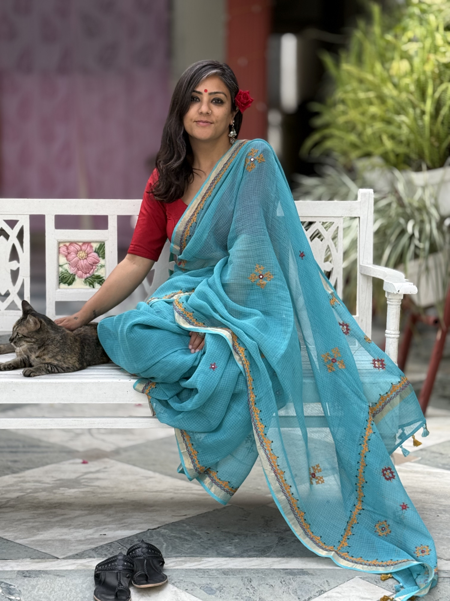 AQUA Kota cotton hand embroidery sari, with a zari woven border, accessorised with tassels.