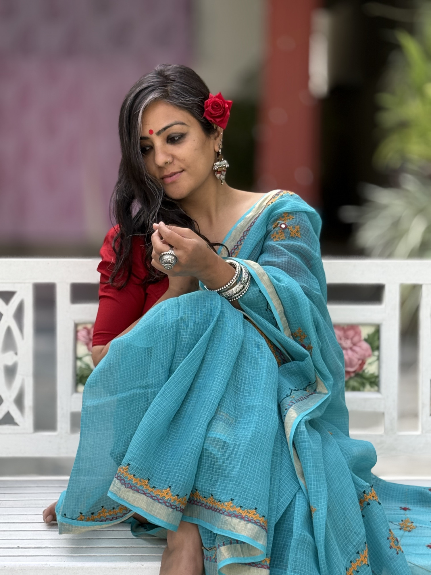 ( we suggest to leave the running blouse inside the sari for extra pleats if you wish to ,kota blouse fabrics are not as sturdy as cotton blouse fabrics. Although we have got embroidery done on running blouses as well, so one can choose to leave it inside or make an extra blouse )