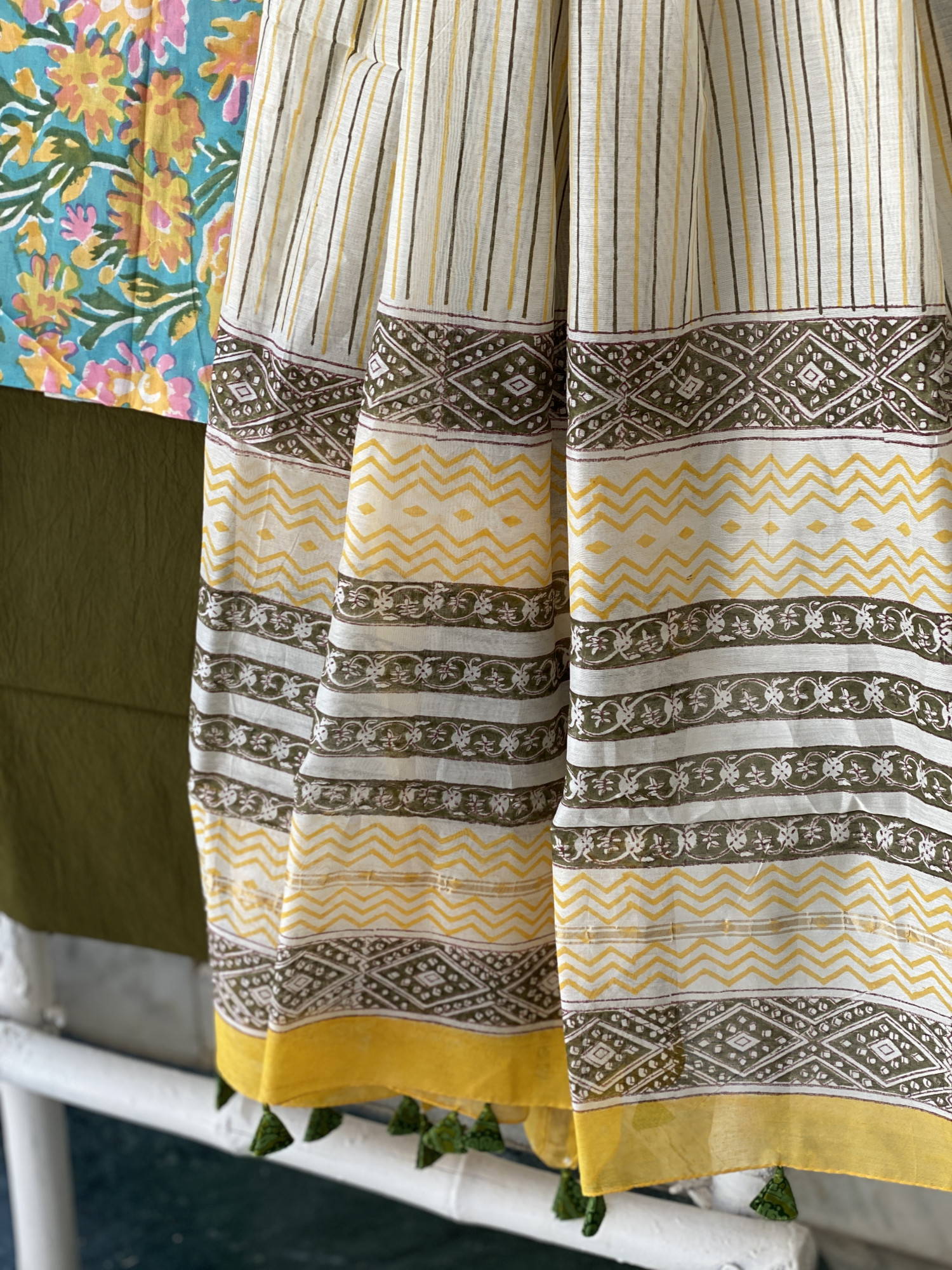 AQUA Cotton BLOCK PRINT SHIRT AND MEHNDI GREEN PLAIN COTTON BOTTOM PAIRED WITH OFF WHITE CHANDERI BLOCK PRINT DUPATTA, ACCESSORISED WITH TASSLES.