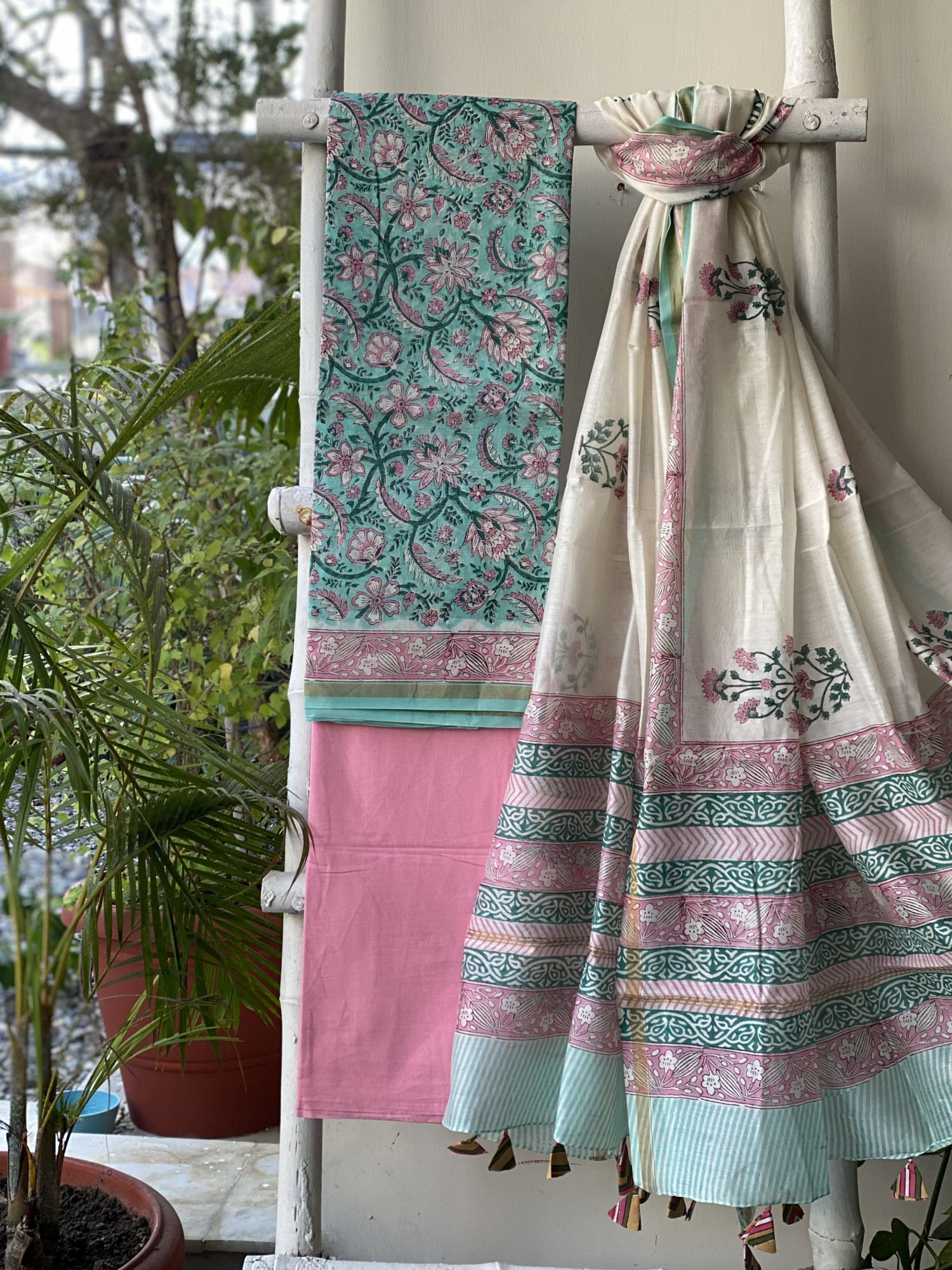 AQUA CHANDERI HAND BLOCK PRINTED SILK & COTTON ZARI WOVEN BORDER SHIRT WITH A PINK PLAIN COTTON MULL BOTTOM PAIRED WITH AN OFF WHITE HAND BLOCK PRINT CHANDERI ZARI WOVEN BORDER DUPATTA, ACCESSORISED WITH TASSLES.