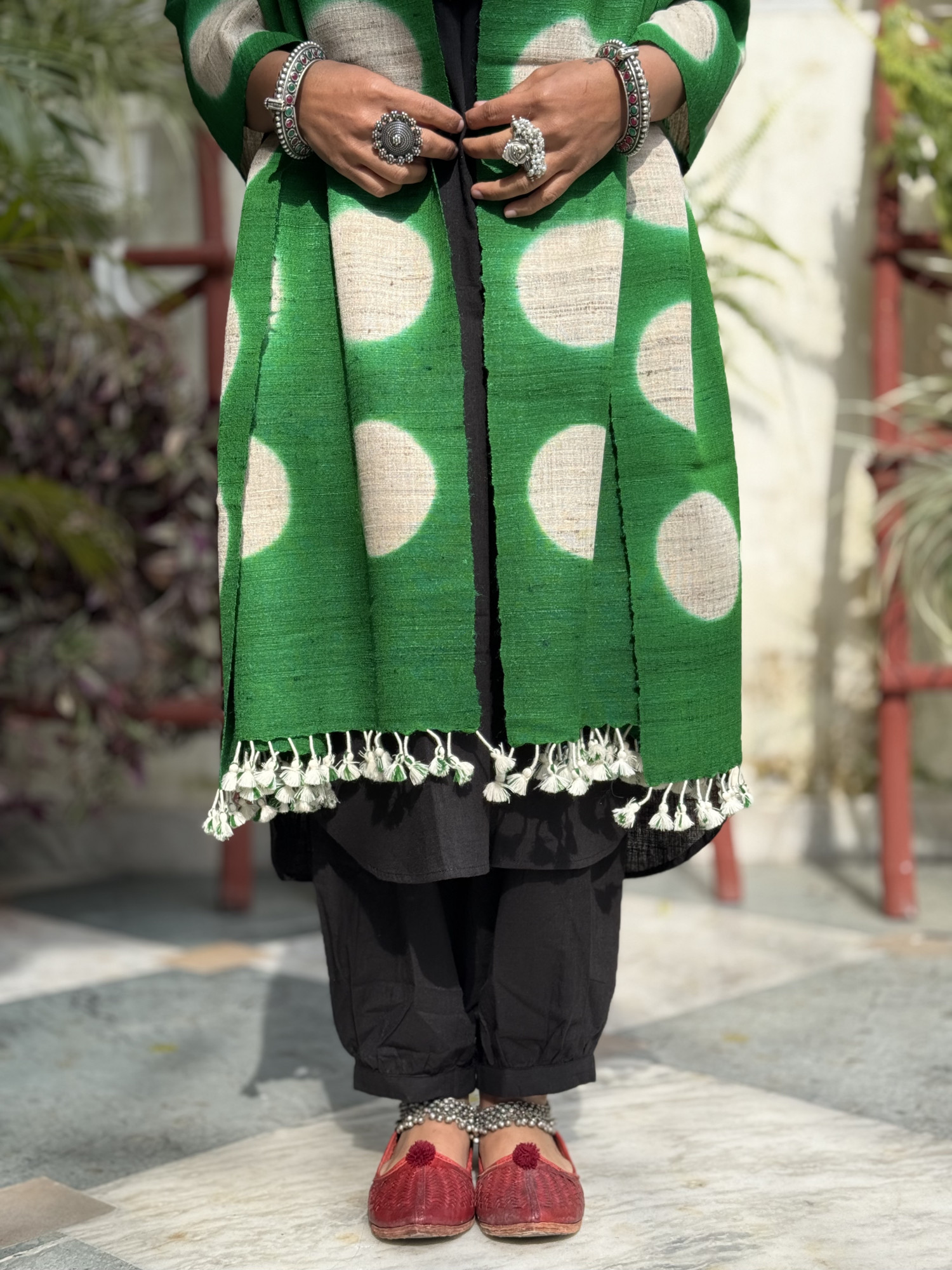 BEIGE & GREEN SILK & merino WOOL CLAMP DYED stole, ACCESSORISED WITH TASSLES.