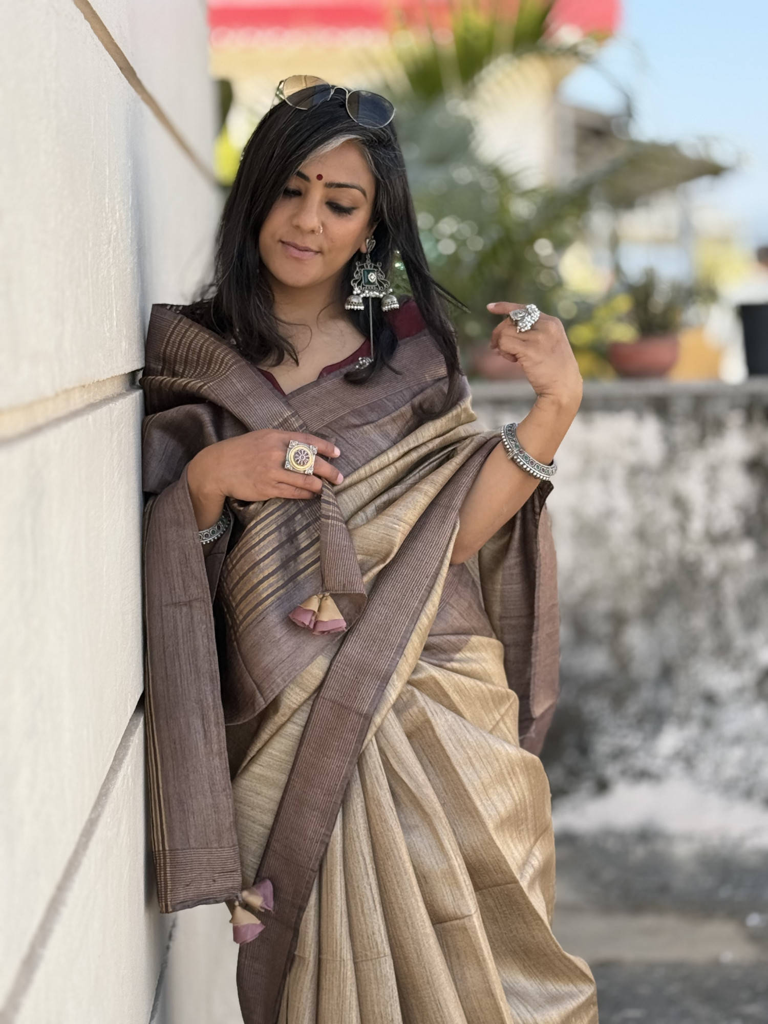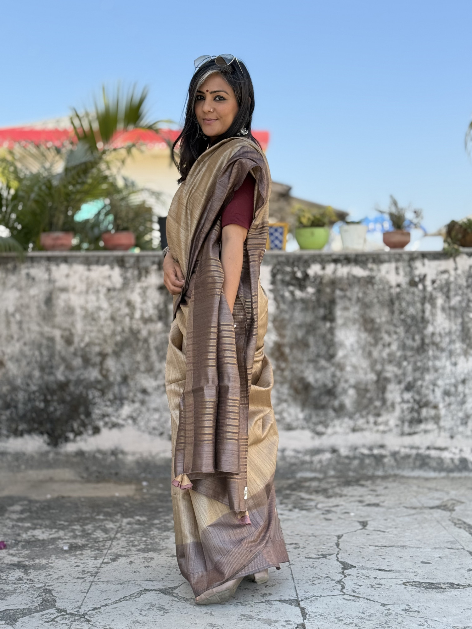 BEIGE-BROWN HAND WOVEN TUSSAR SILK SARI