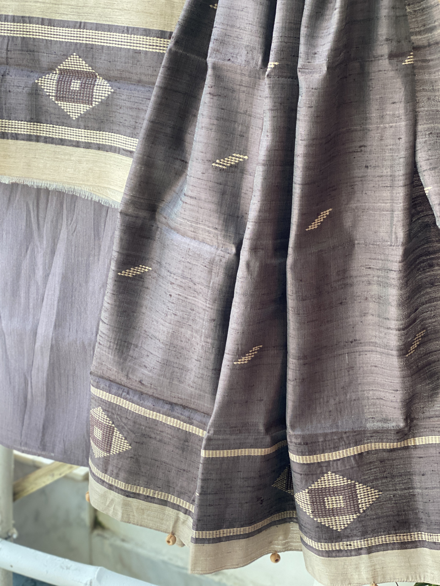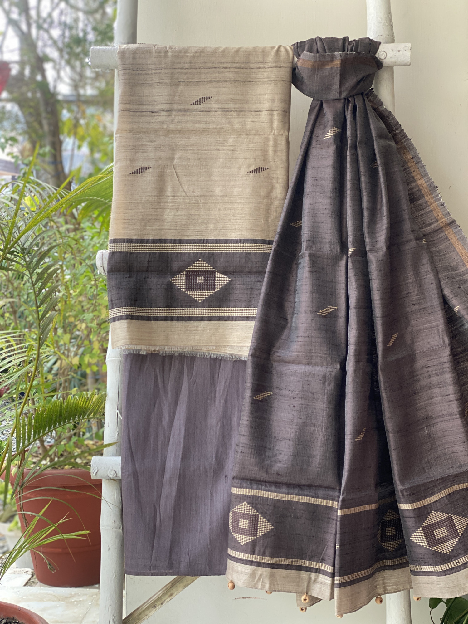 BEIGE HANDLOOM SILK WOVEN SHIRT AND BROWN WOVEN SILK PLAIN BOTTOM PAIRED WITH A STONE BROWN HANDLOOM SILK WOVEN DUPATTA WITH ZARI BORDER. ACCESSORISED WITH TASSELS