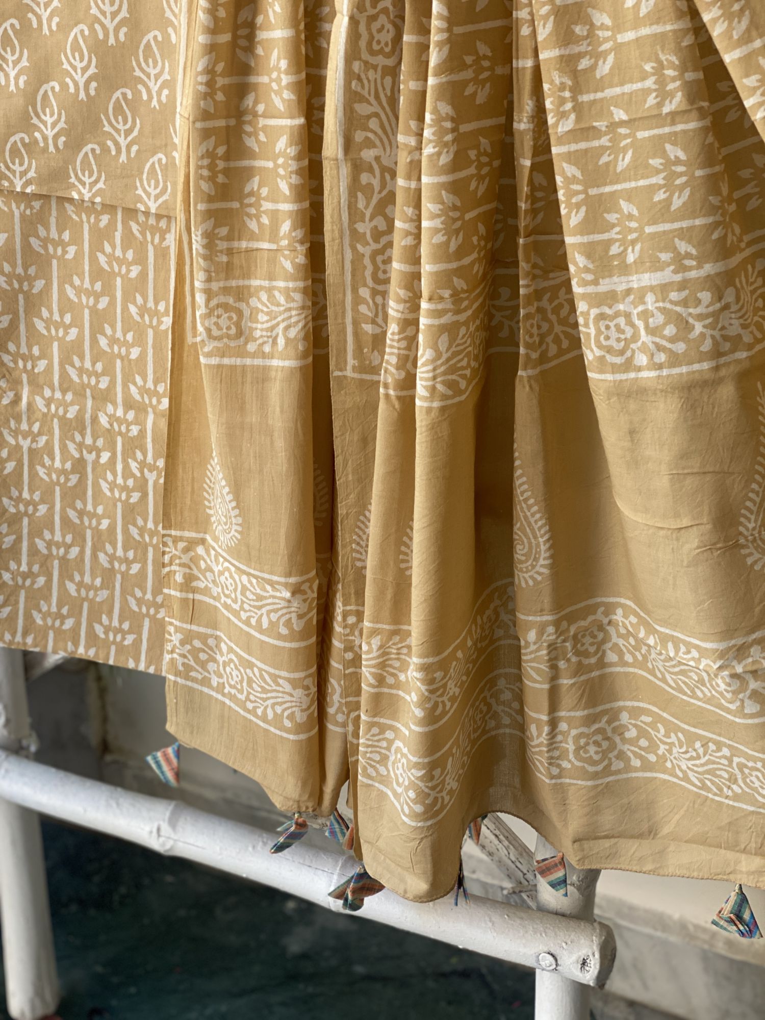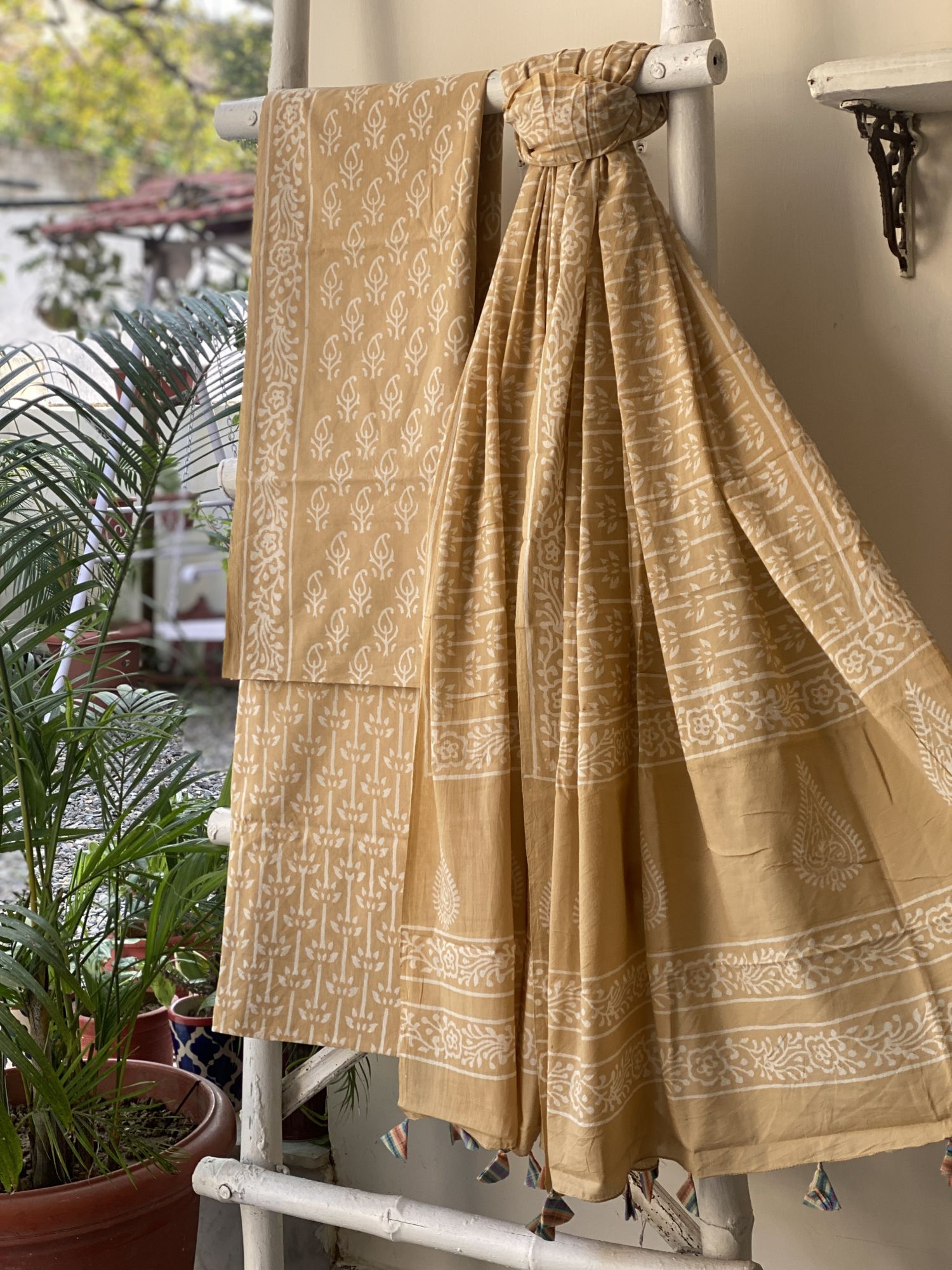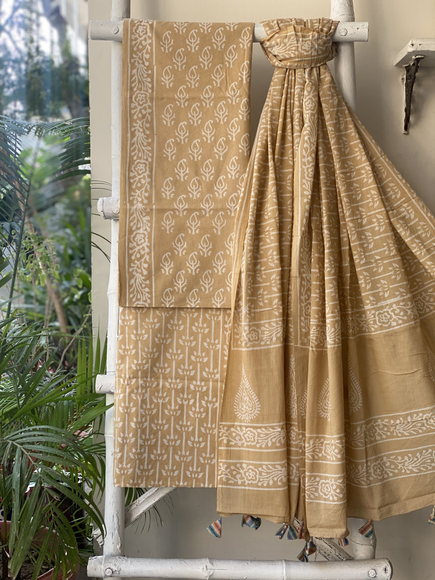 BEIGE HAND BLOCK PRINT MUL COTTON SHIRT AND BOTTOM, PAIRED WITH A BEIGE MUL COTTON HAND BLOCK PRINT DUPATTA, ACCESSORISED WITH TASSLES.