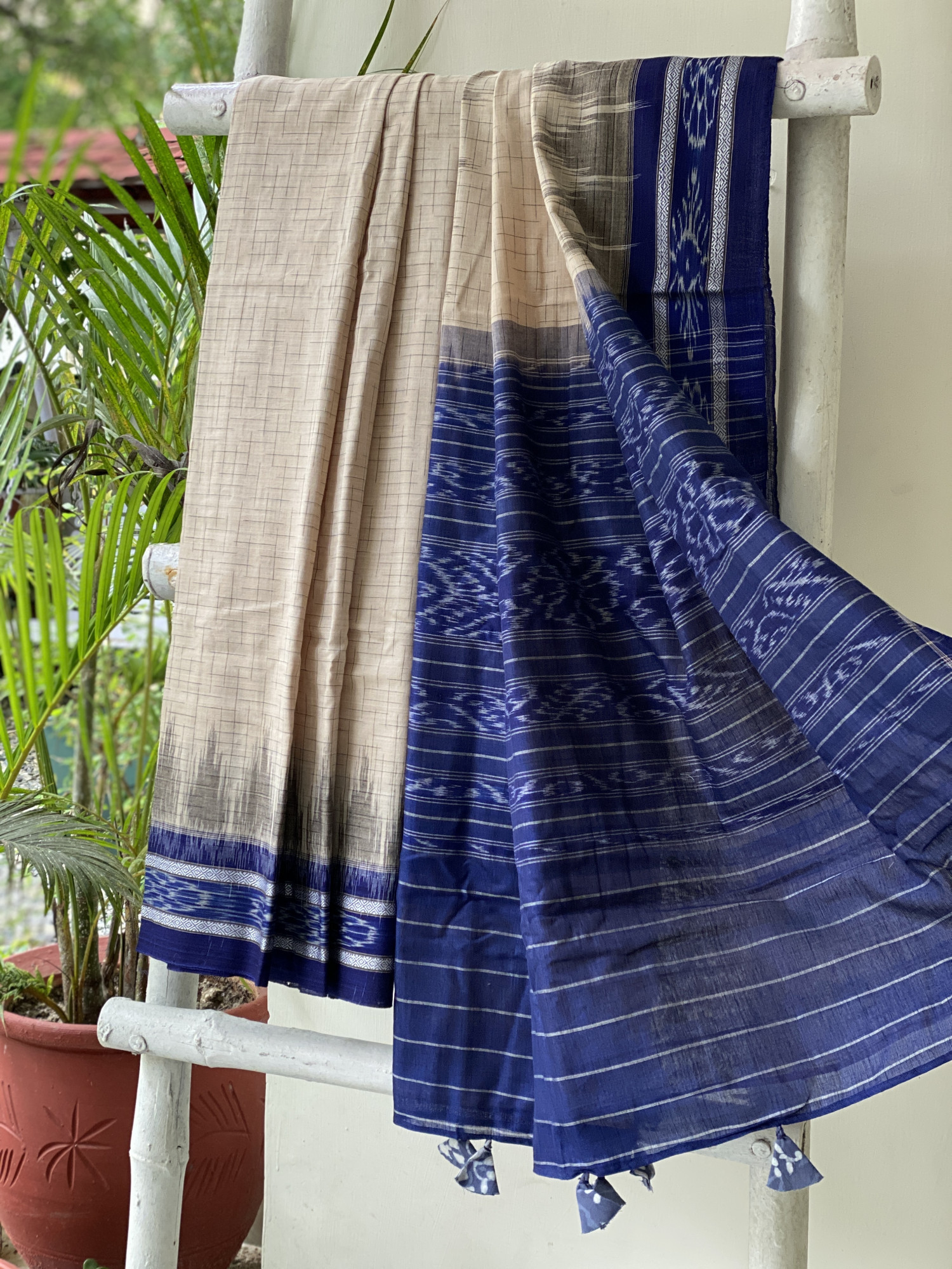 BEIGE-INDIGO cotton 'JHARNA ' IKKAT woven sari accessorized with tassels.