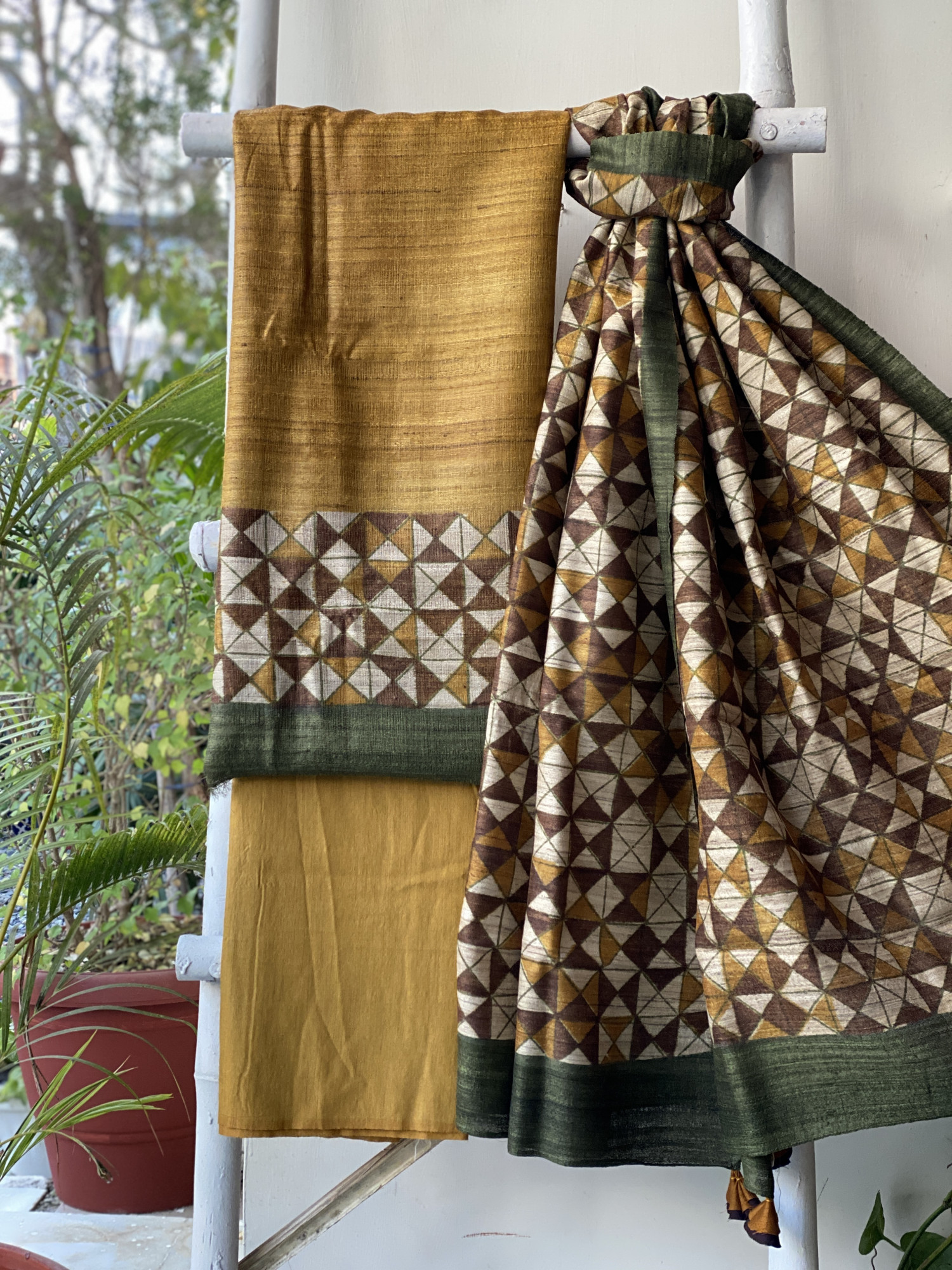MUSTARD GICHA SILK PRINTED SHIRT AND MUSTARD WOVEN SILK PLAIN BOTTOM PAIRED WITH A MULTI COLOUR GICHA SILK PRINTED DUPATTA . ACCESSORISED WITH TASSELS