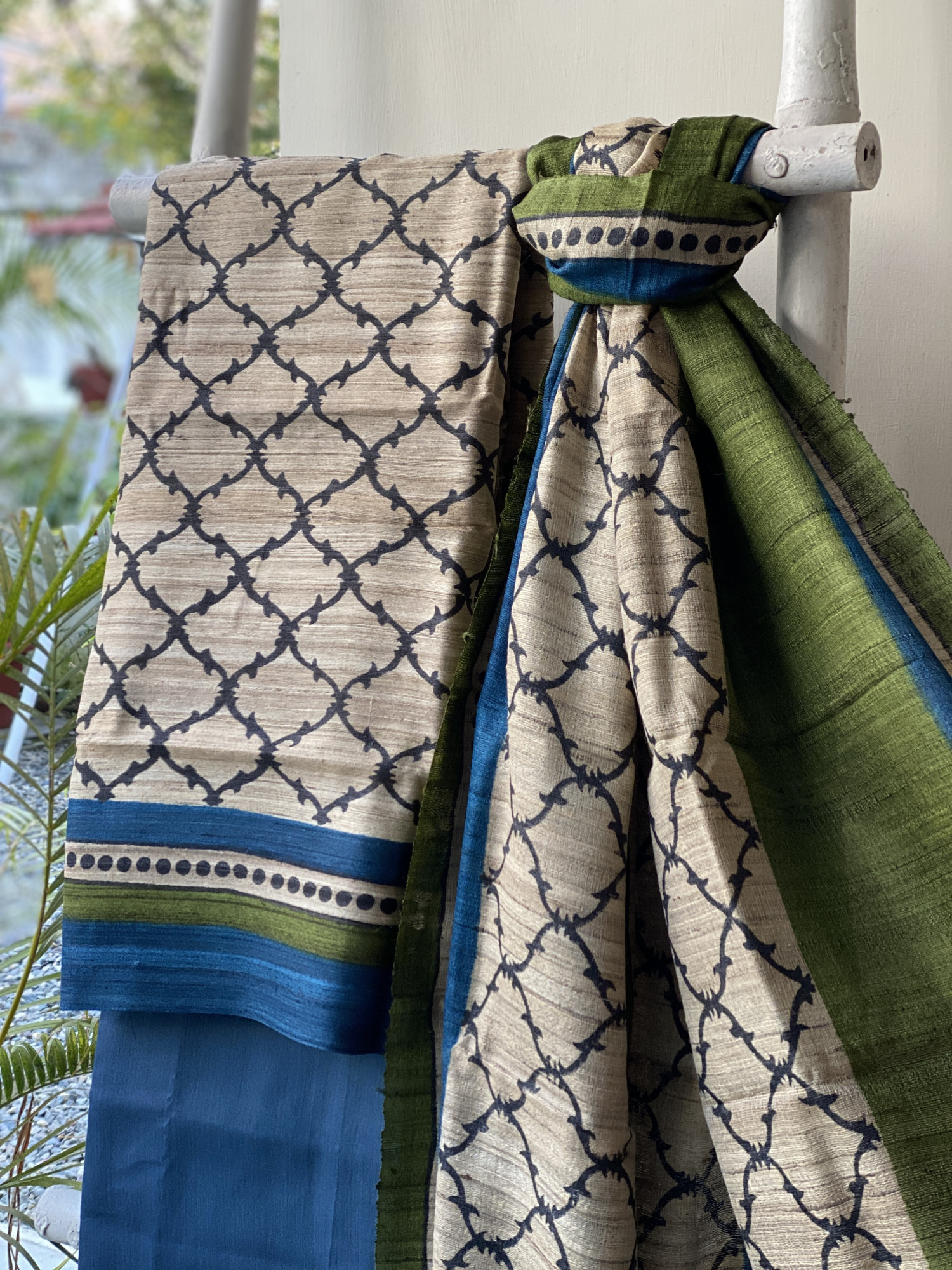 BEIGE-INDIGO GICHA SILK PRINTED SHIRT AND INDIGO WOVEN SILK PLAIN BOTTOM PAIRED WITH A BEIGE-INDIGO GICHA SILK PRINTED DUPATTA . ACCESSORISED WITH TASSELS