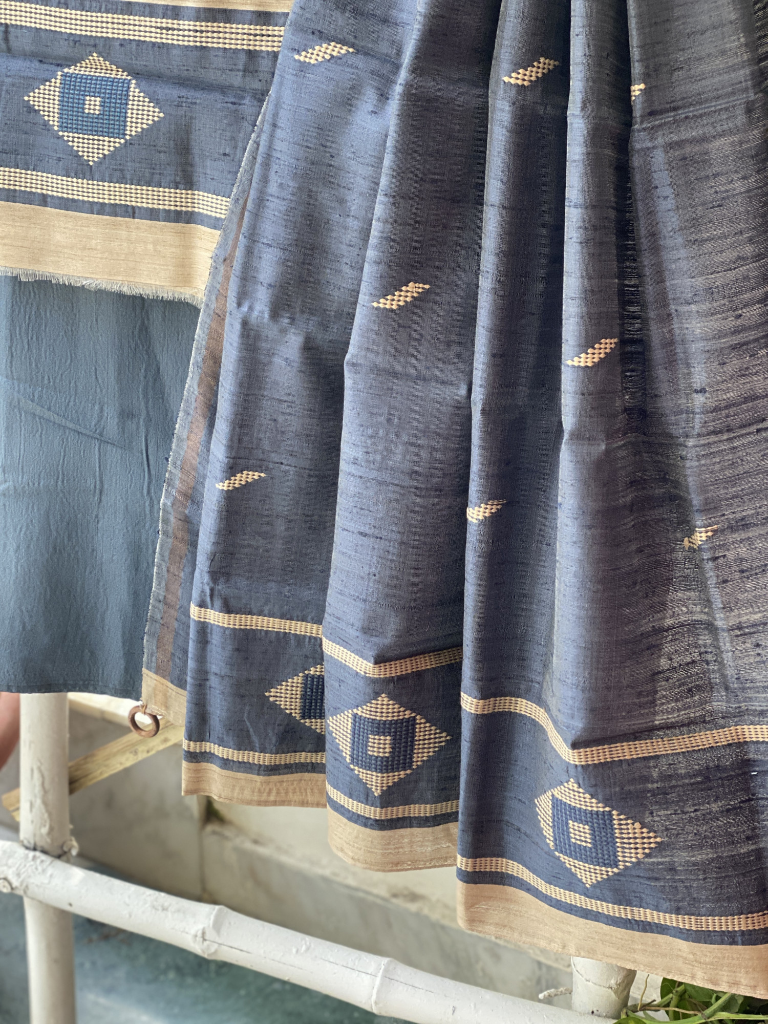 BEIGE HANDLOOM SILK WOVEN SHIRT AND INDIGO WOVEN SILK PLAIN BOTTOM PAIRED WITH AN INDIGO HANDLOOM SILK WOVEN DUPATTA WITH ZARI BORDER. ACCESSORISED WITH TASSELS