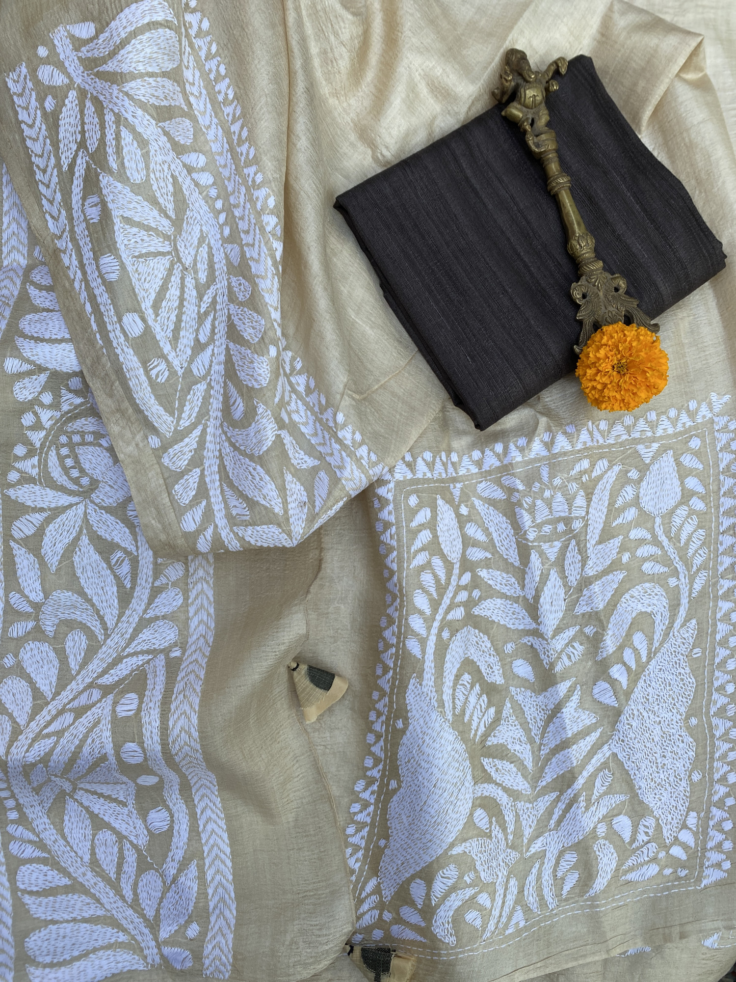 Comes with its own BEIGE TUSSAR SILK BLOUSE WITH KANTHA HAND EMBROIDERY AND AN EXTRA BROWN TUSSAR SILK BLOUSE PIECE ( 90 cm)