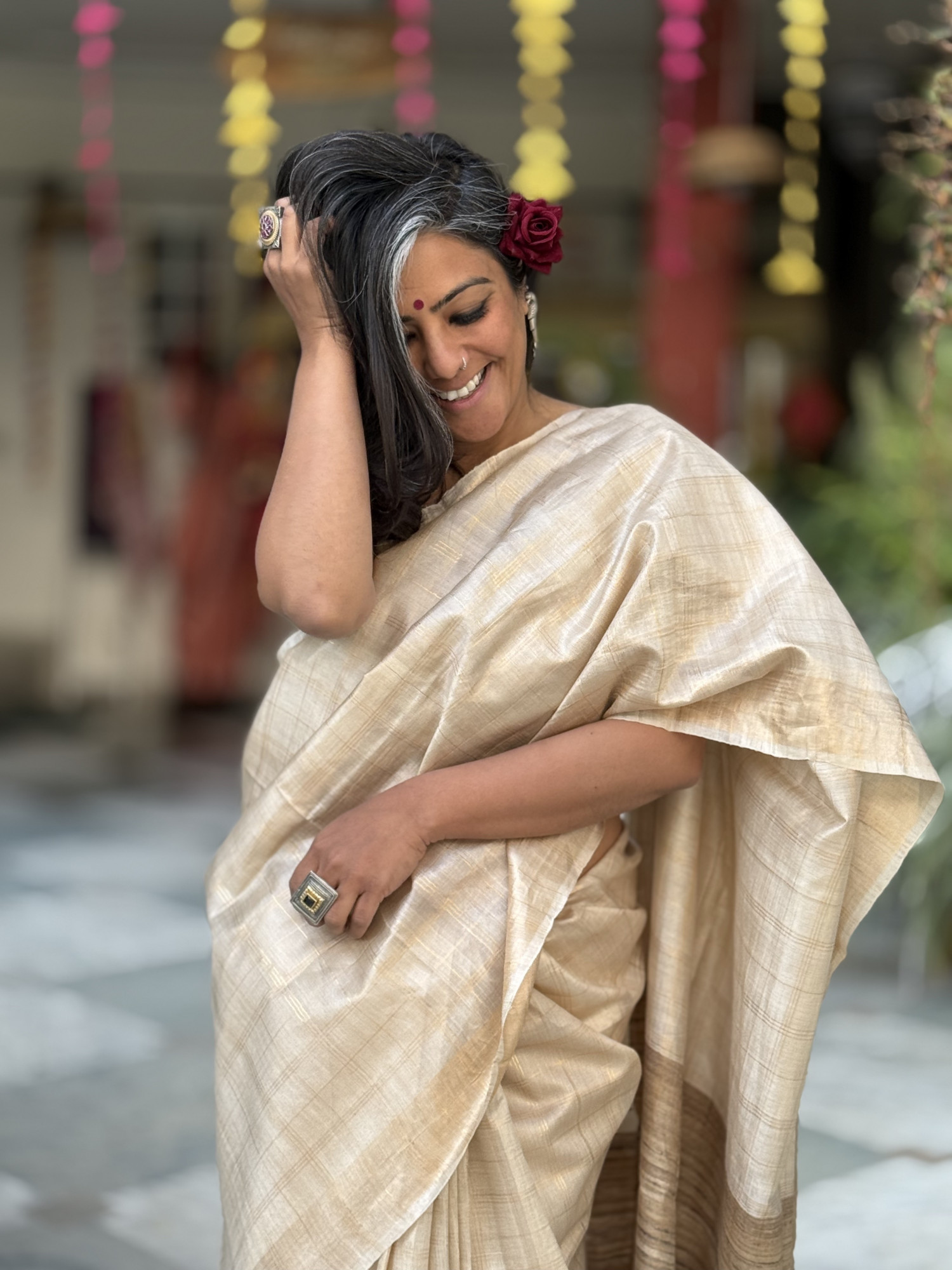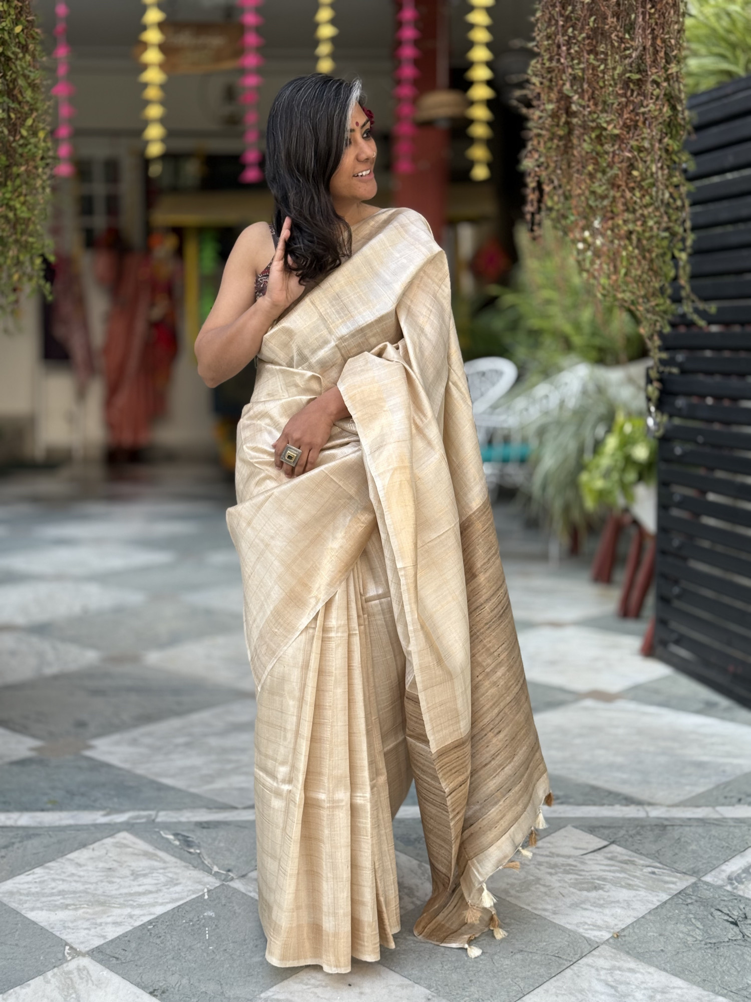 BEIGE ZARI CHECKERED DESI TUSSAR WOVEN SILK sari with WITH GICHA SILK WOVEN PALLA accessorised with tassles.