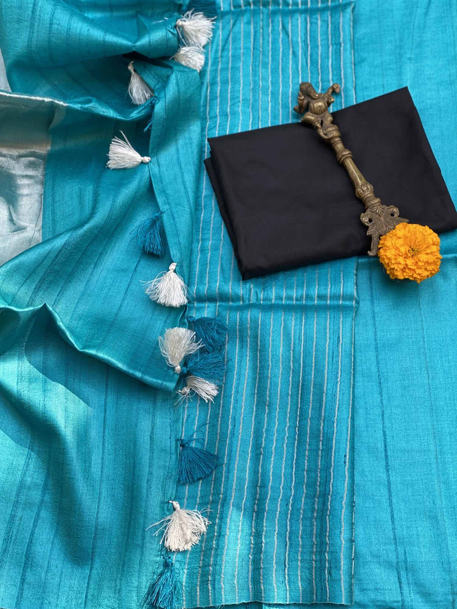 SKY BLUE DESI TUSSAR WOVEN SILK sari with WITH DOUBLE ZARI patta WOVEN PALLA accessorised with tassles.