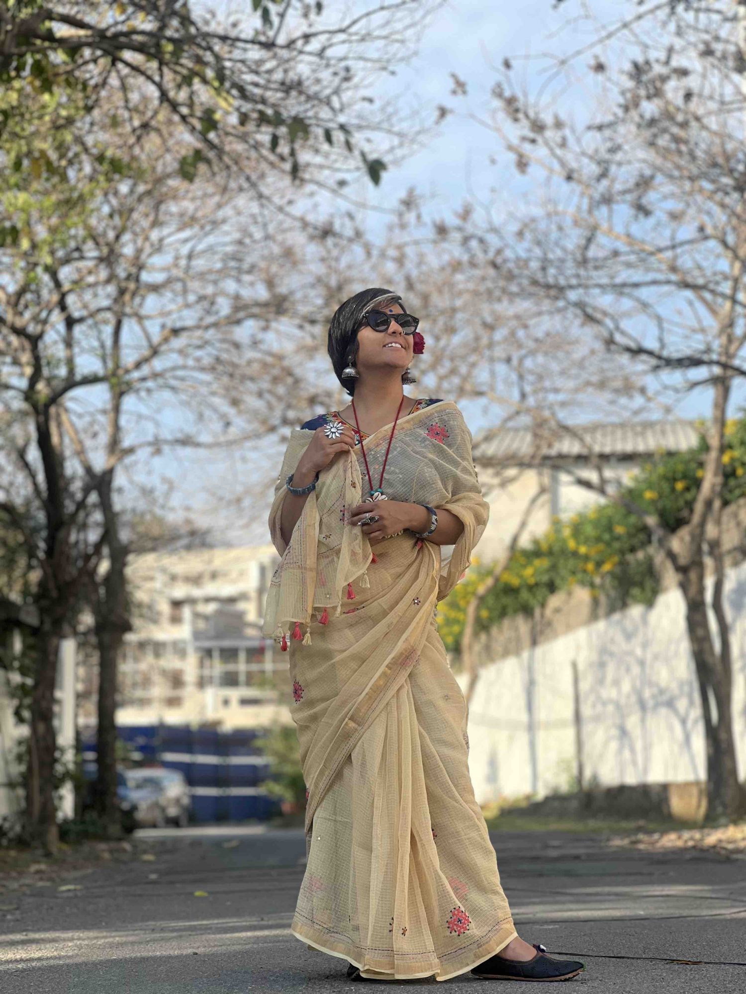 BEIGE Kota cotton hand embroidery sari, with a zari woven border, accessorised with tassels.