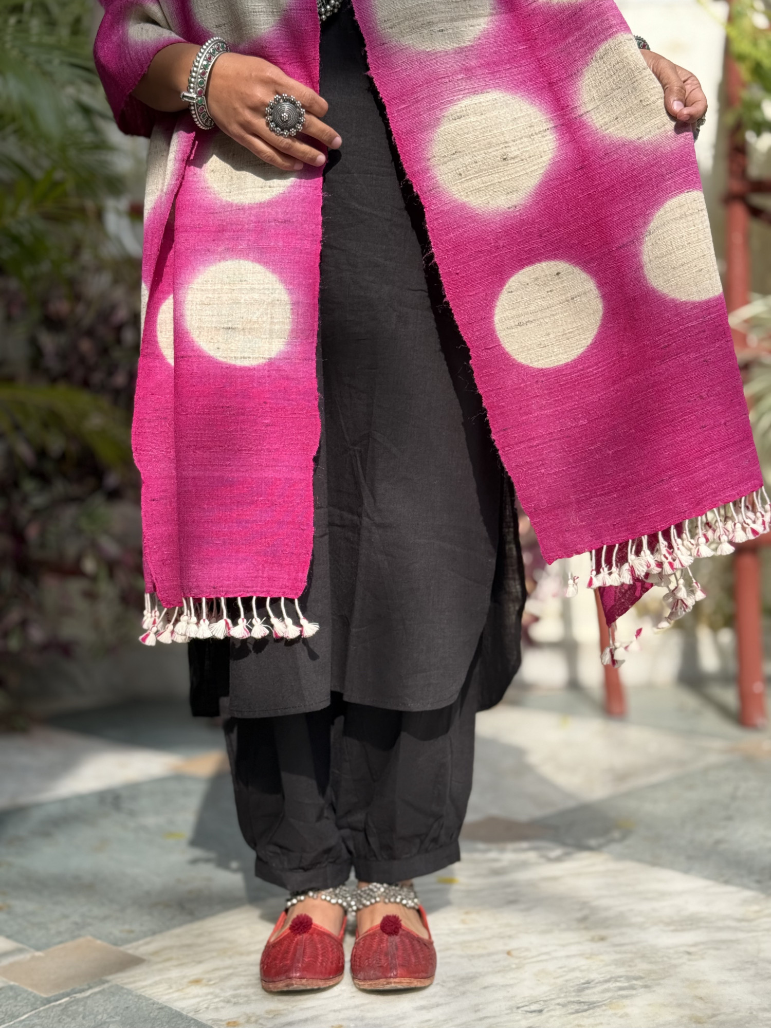 BEIGE & MAGENTA SILK & merino WOOL CLAMP DYED stole, ACCESSORISED WITH TASSLES.