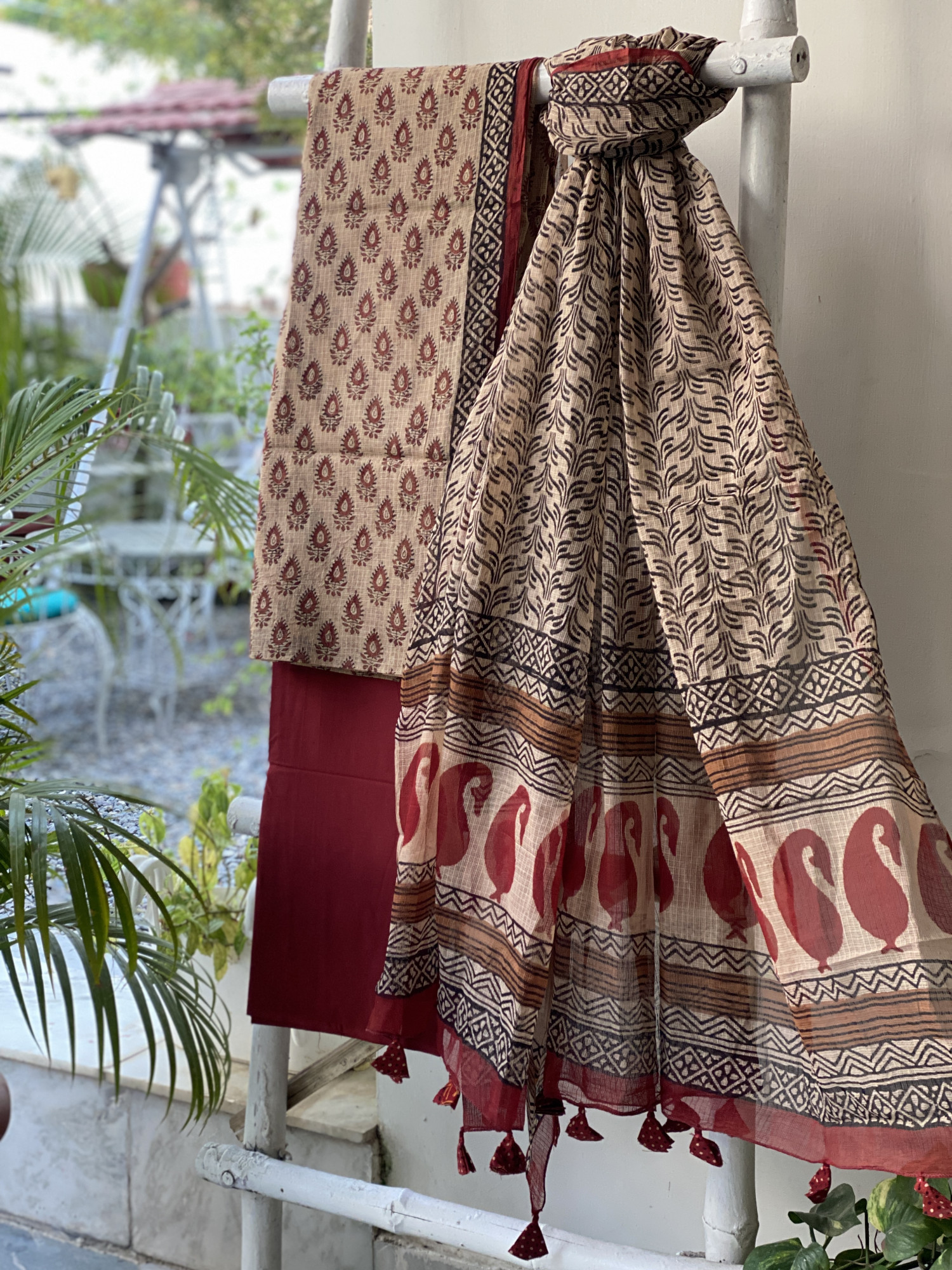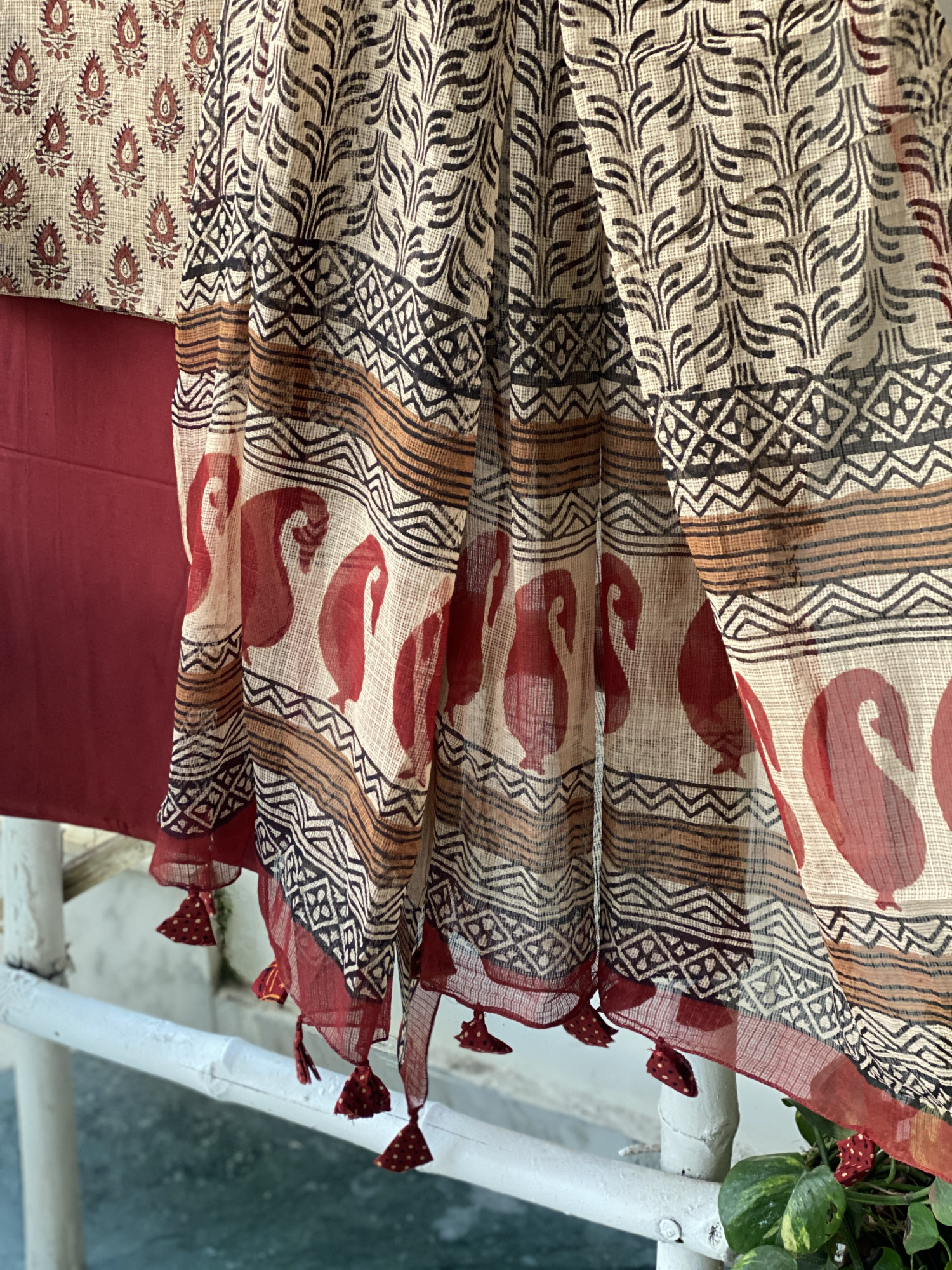 BEIGE HAND BLOCK "BAGH" PRINT KOTA SHIRT (COMES WITH A MATCHING COTTON LINING PIECE) AND MAROON COTTON PLAIN BOTTOM PAIRED WITH BEIGE-BLACK KOTA BLOCK PRINT DUPATTA, ACCESSORISED WITH TASSLES.