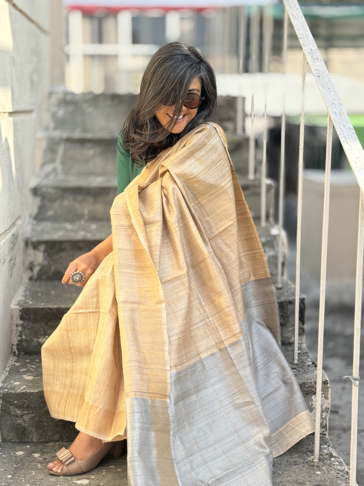 BEIGE-GREY HAND WOVEN TUSSAR SILK SARI