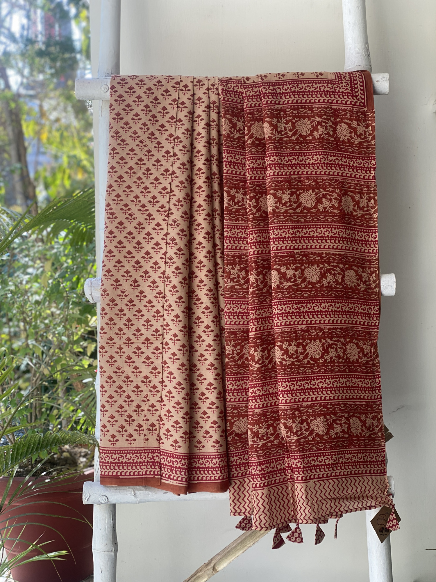 BEIGE-RED Cotton mull hand block print sari, accessorised with tassles. Comes with A RED COTTON HAND BLOCK PRINT blouse