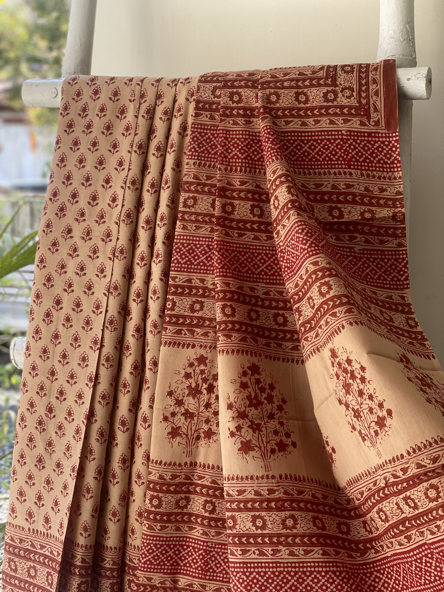 BEIGE-RED Cotton mull hand block print sari, accessorised with tassles. Comes A DARK BLUE COTTON HAND BLOCK PRINT blouse