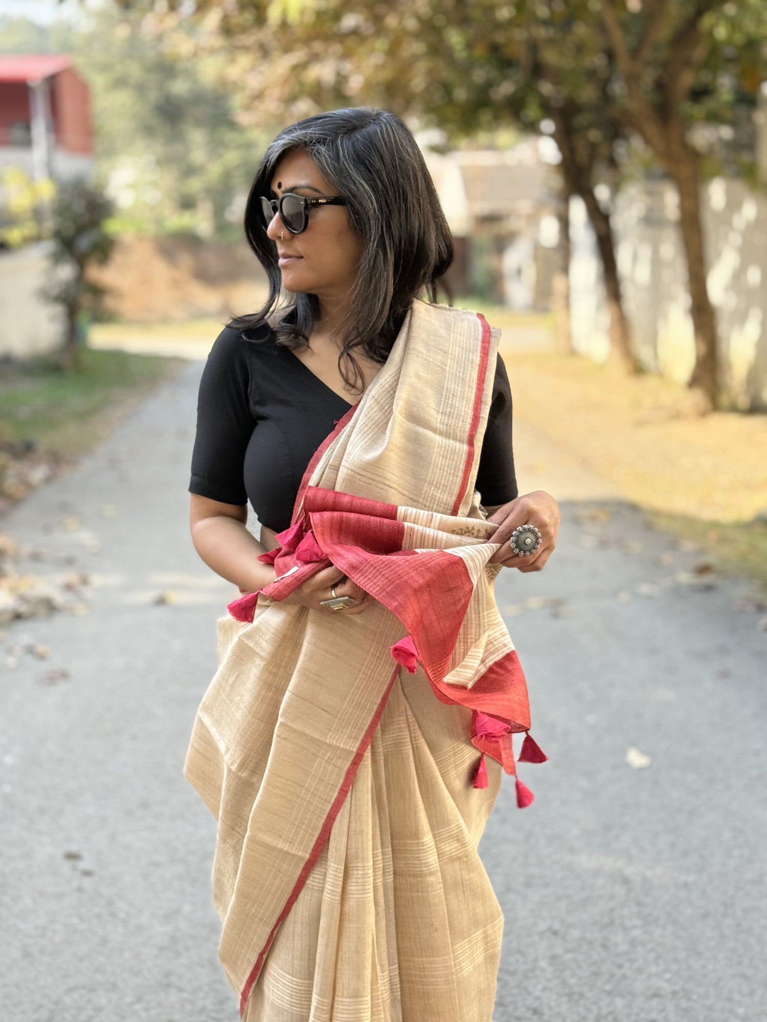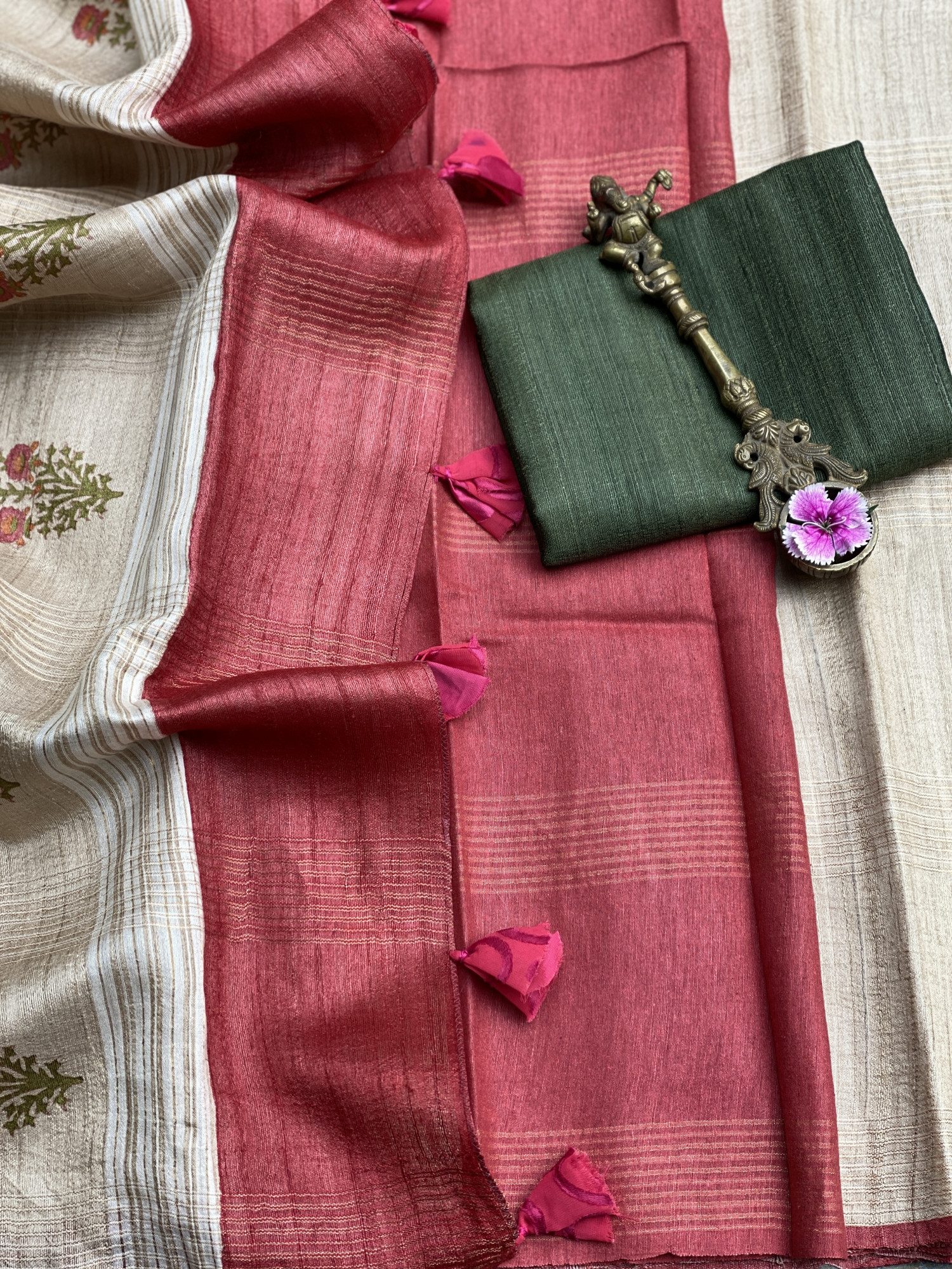 BEIGE-RED HAND BLOCK PRINT TUSSAR SILK SARI