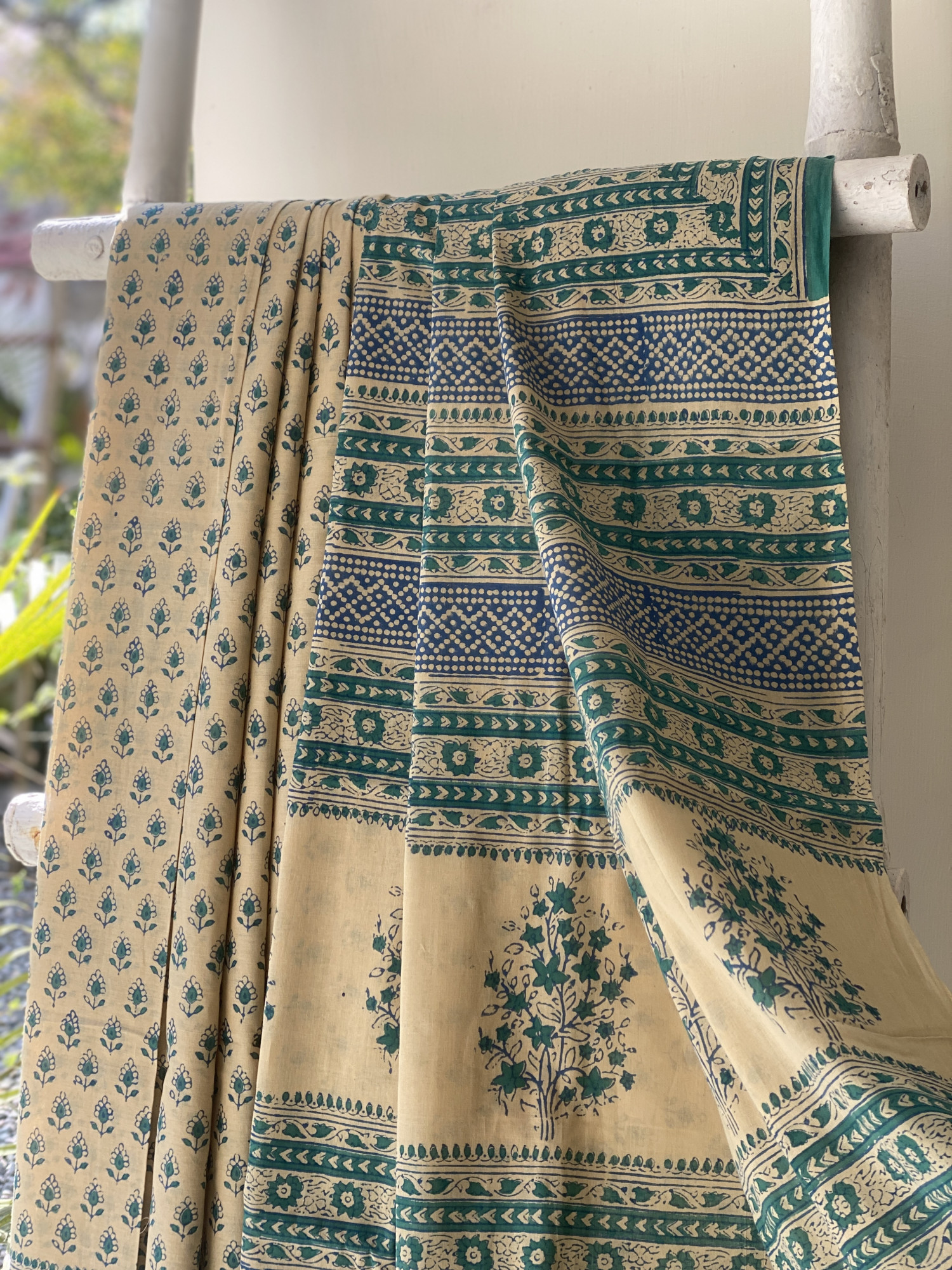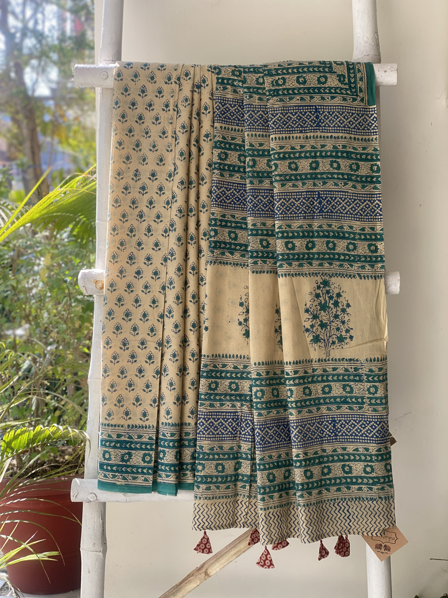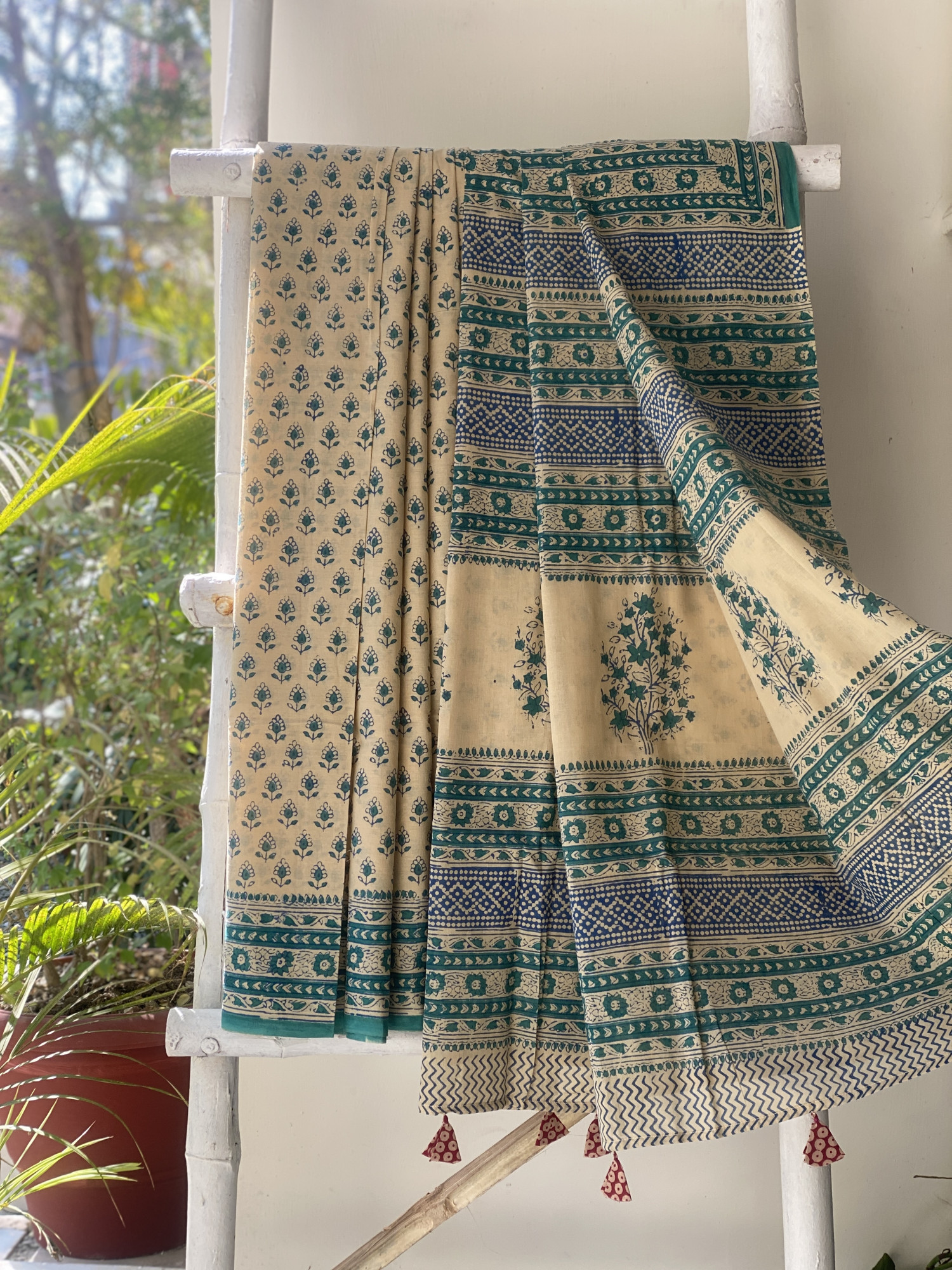 BEIGE-TEAL Cotton mull hand block print sari, accessorised with tassles. Comes with A TEAL COTTON HAND BLOCK PRINT blouse