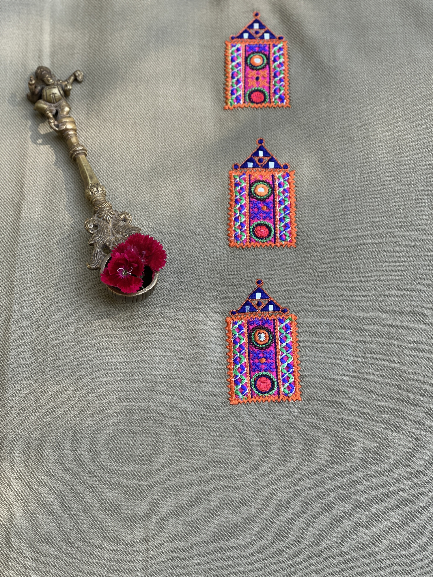 BEIGE WOOLLEN KAFTAN, WITH PATCHWORK AND MANUAL MACHINE EMBROIDERY.