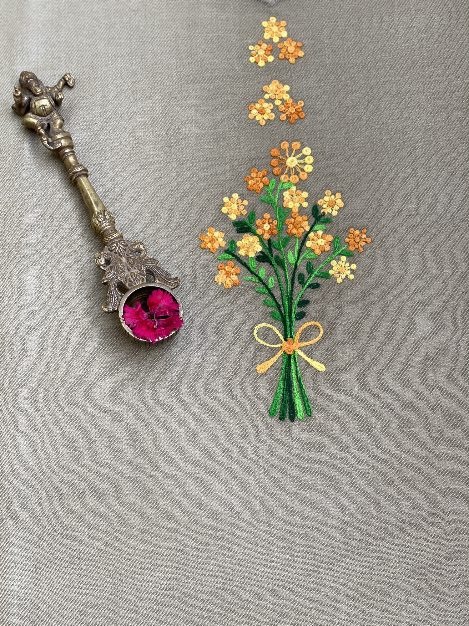 BEIGE WOOLLEN KAFTAN, WITH PATCHWORK AND MANUAL MACHINE EMBROIDERY.