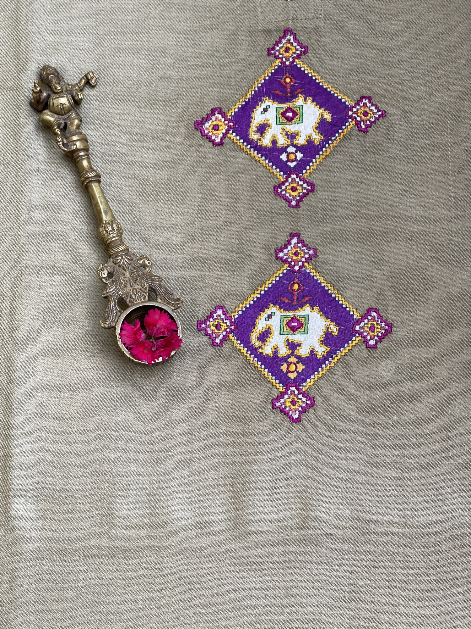 BEIGE WOOLLEN KAFTAN, WITH PATCHWORK AND MANUAL MACHINE EMBROIDERY.