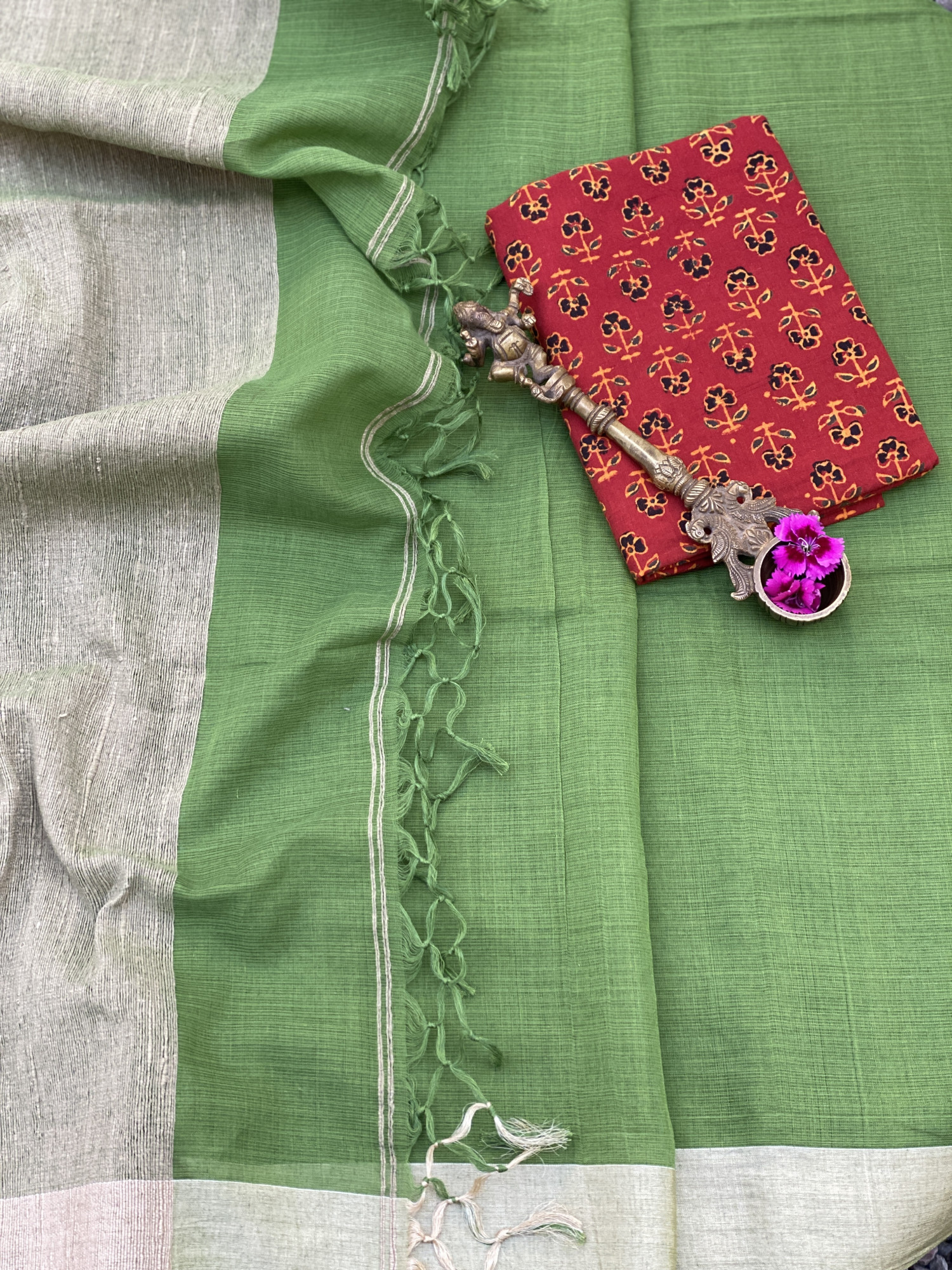 GREEN "BENGAL HANDLOOM" KHADI MUL WOVEN SARI WITH SILK WOVEN BORDERS AND JUTE WOVEN PALLA.