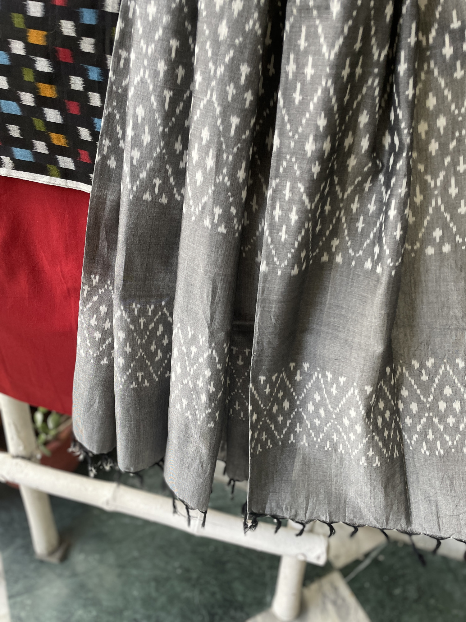 BLACK-MULTI COLOR MERCERISED COTTON WOVEN IKKAT SHIRT WITH MAROON COTTON BOTTOM paired with a GREY MERCERISED COTTON WOVEN IKKAT dupatta