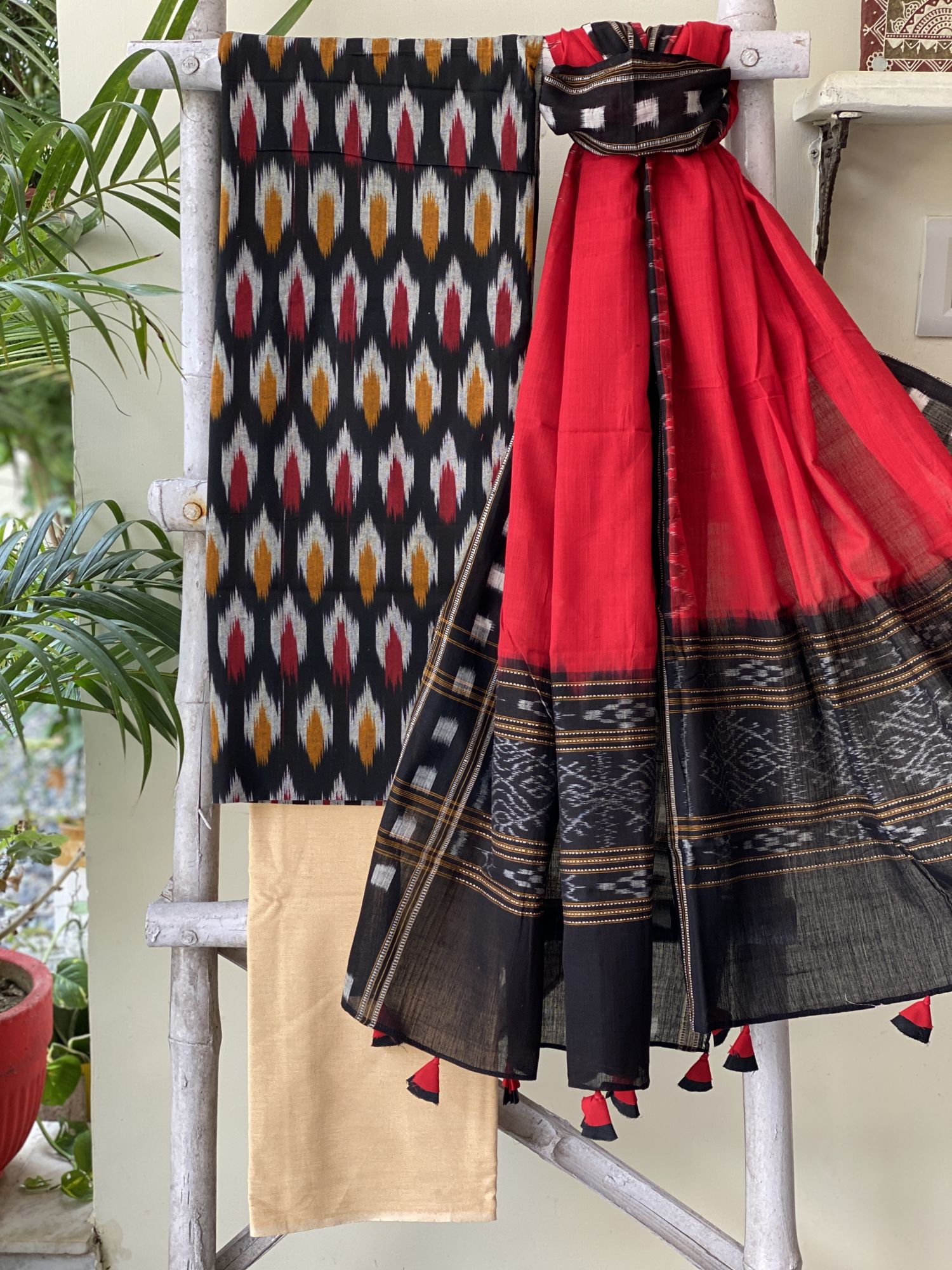 BLACK cotton woven ikkat SHIRT with A BEIGE cotton BOTTOM paired with a RED-BLACK cotton woven SAMBALPURI IKKAT dupatta.
