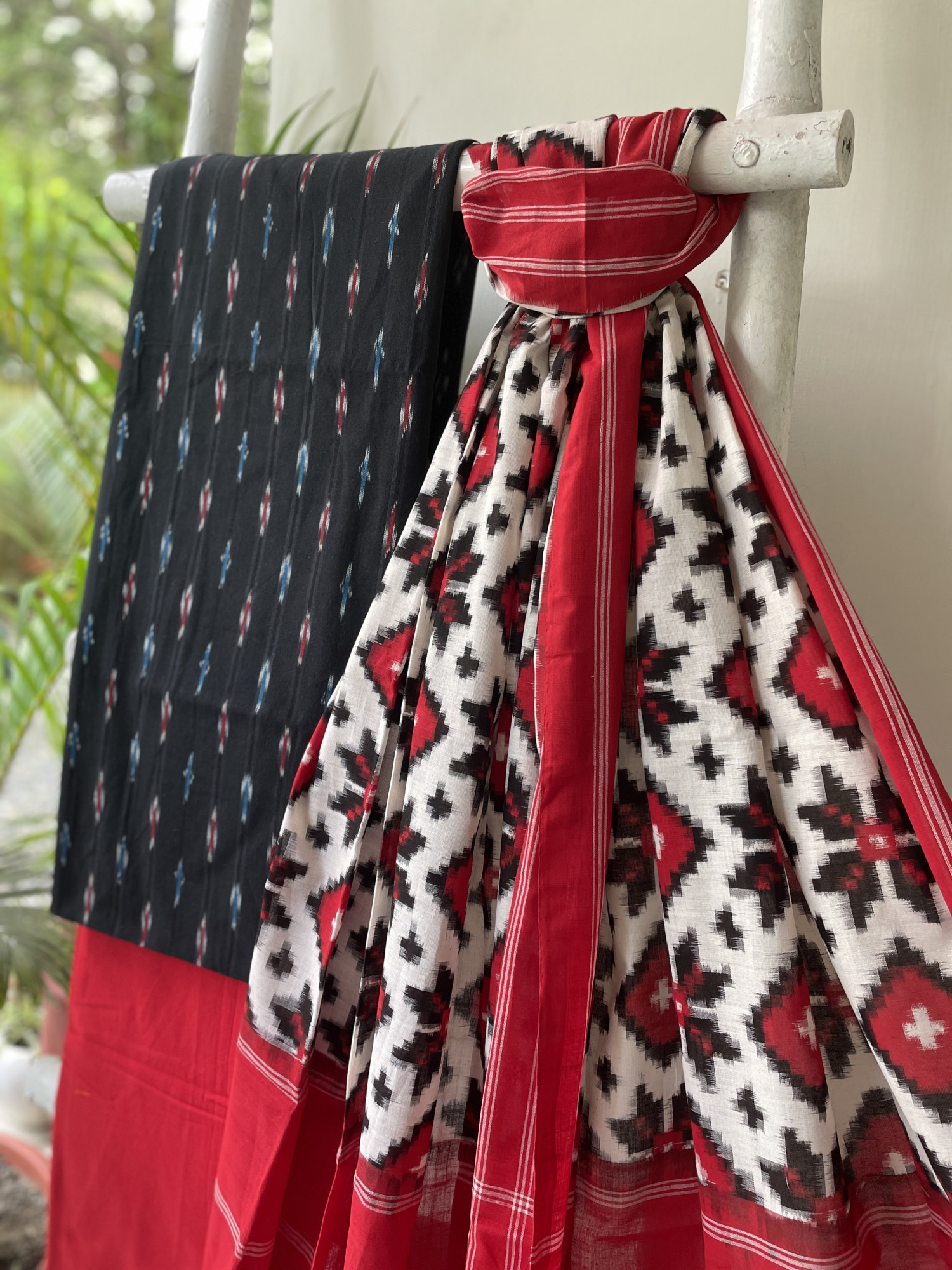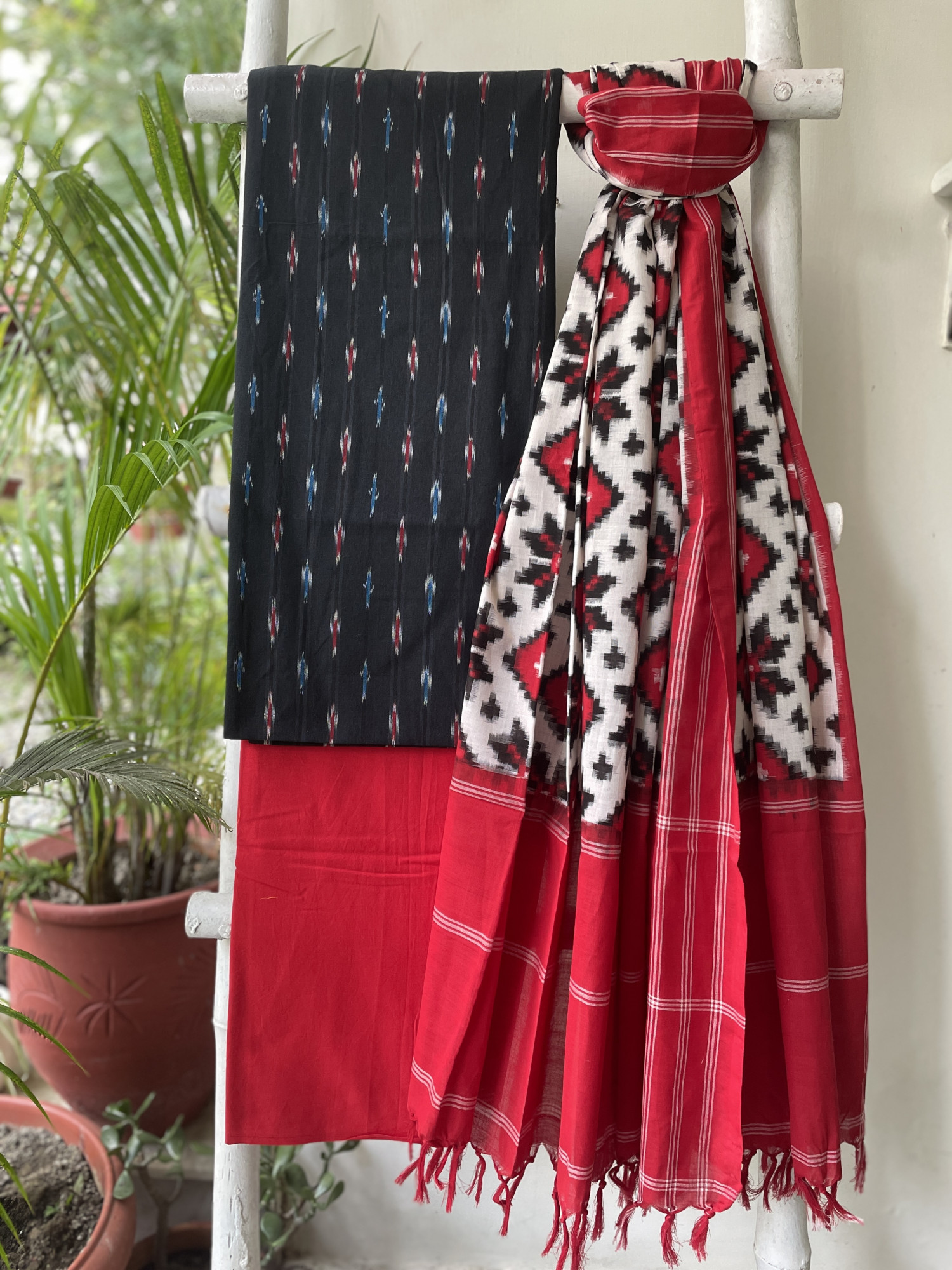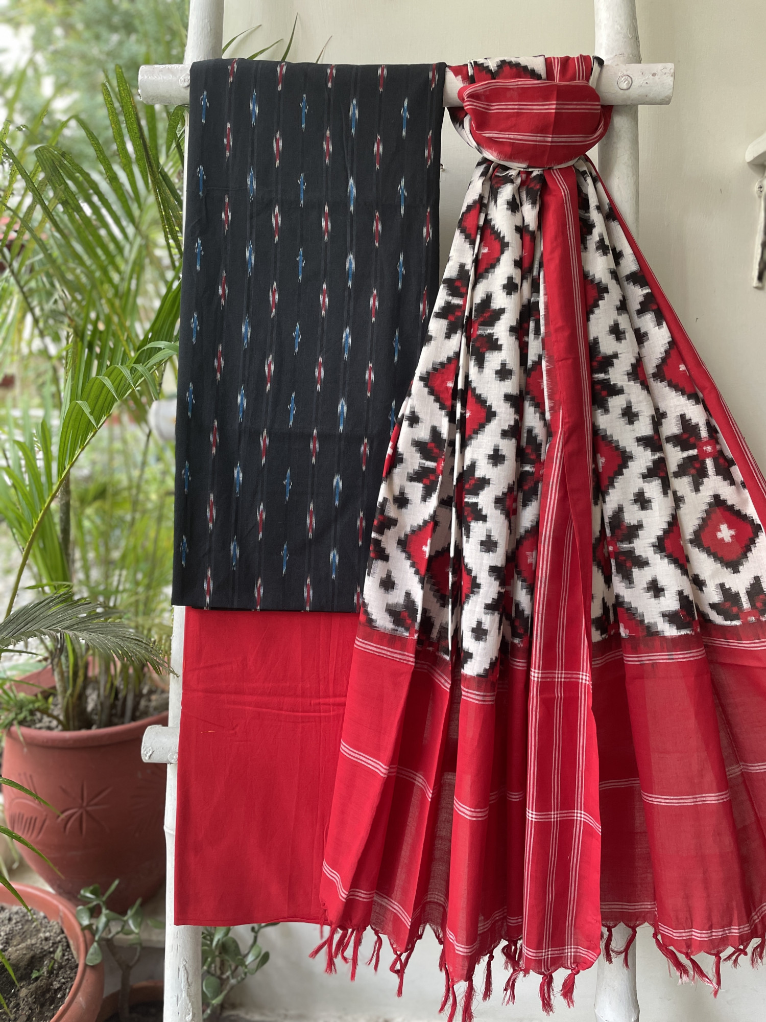 BLACK COTTON WOVEN IKKAT SHIRT WITH RED COTTON BOTTOM paired with a WHITE & RED IKKAT TELIA COTTON WOVEN dupatta