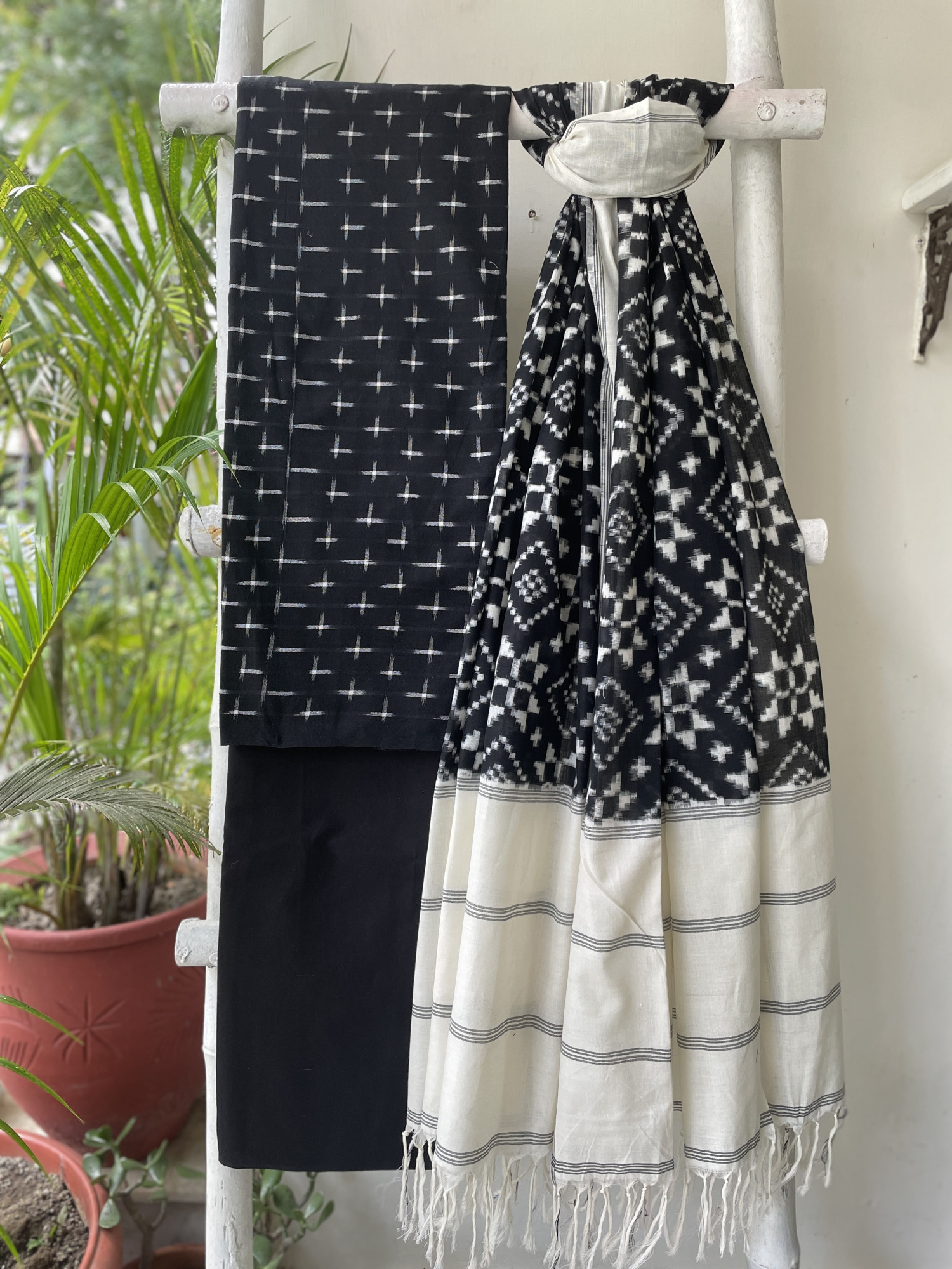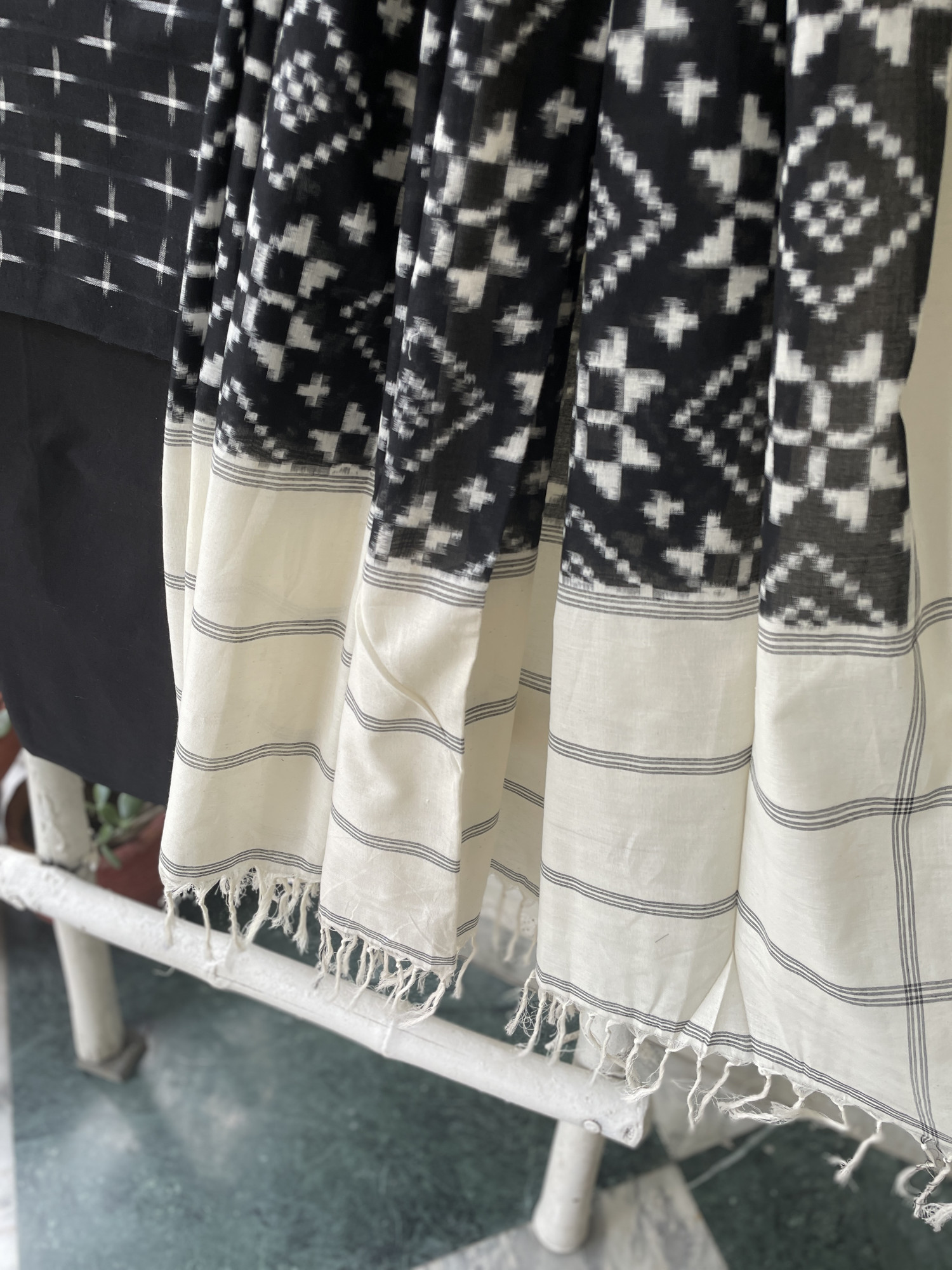 BLACK COTTON WOVEN IKKAT SHIRT WITH BLACK COTTON BOTTOM paired with a BLACK & WHITE IKKAT TELIA COTTON WOVEN dupatta