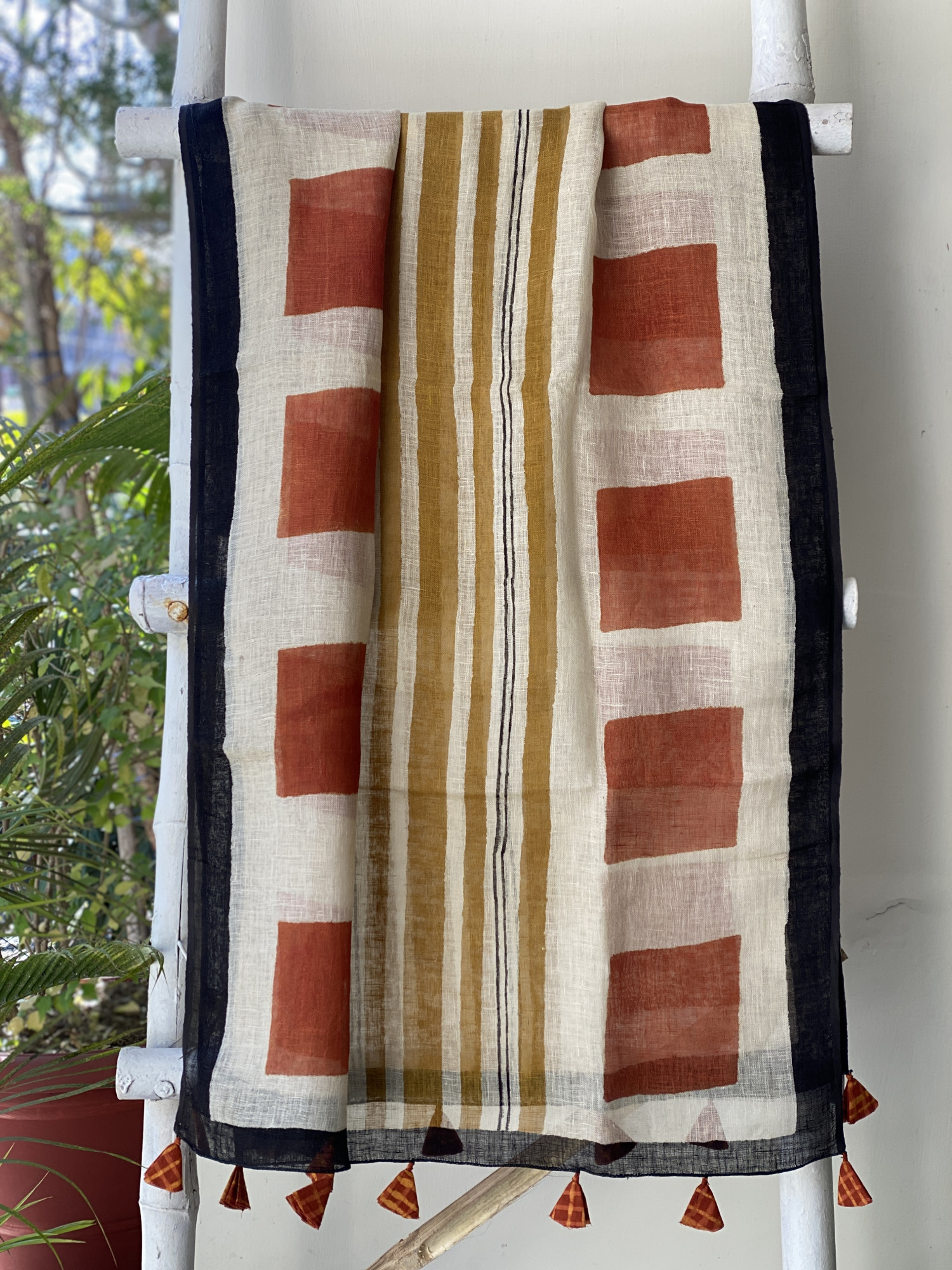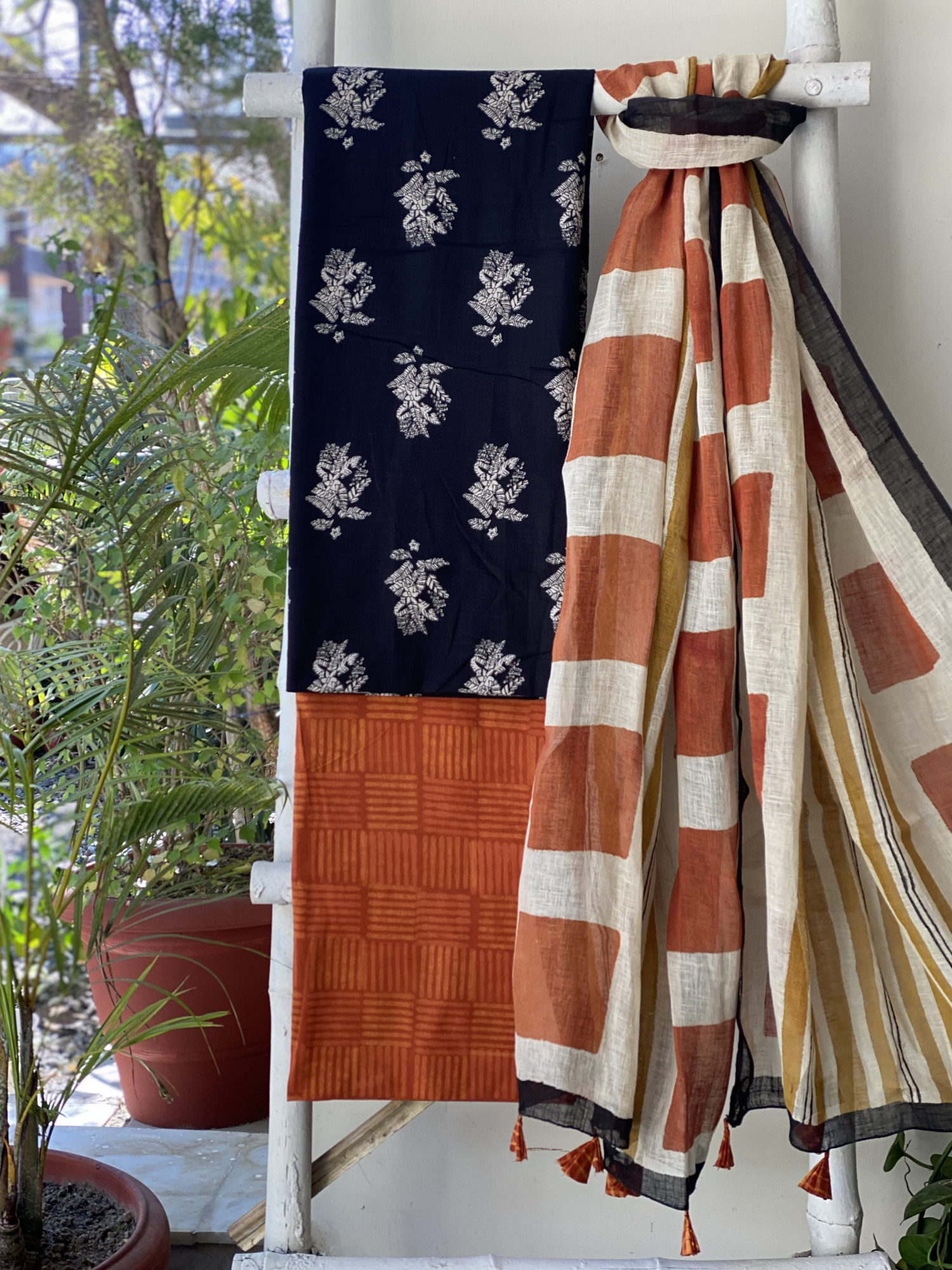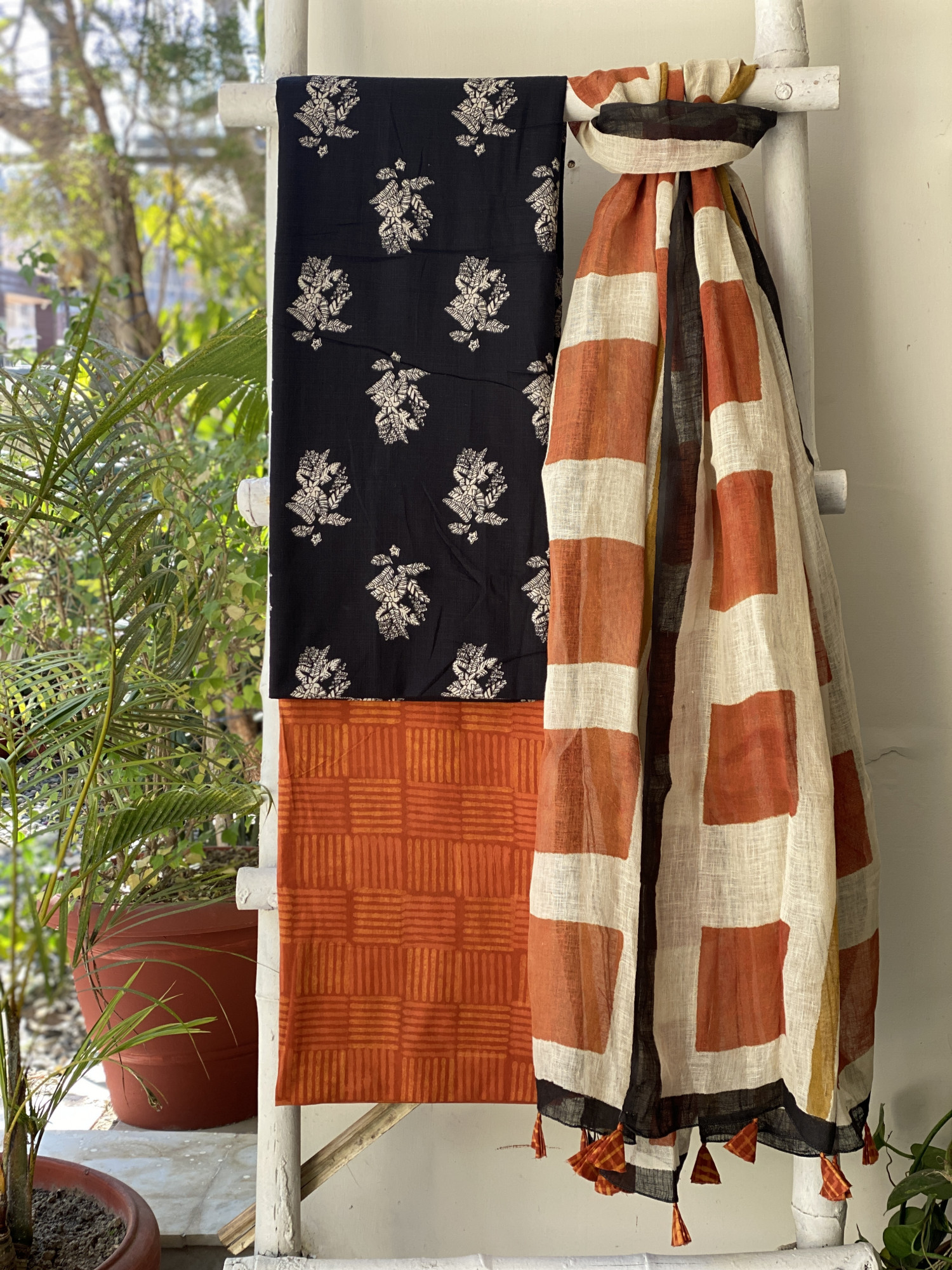 BLACK HAND BLOCK PRINT COTTON SHIRT AND A RUST HAND BLOCK PRINTED COTTON BOTTOM, PAIRED WITH A BEIGE GEOMETRIC PATTERN HAND BLOCK PRINTED COTTON LINEN DUPATTA.
