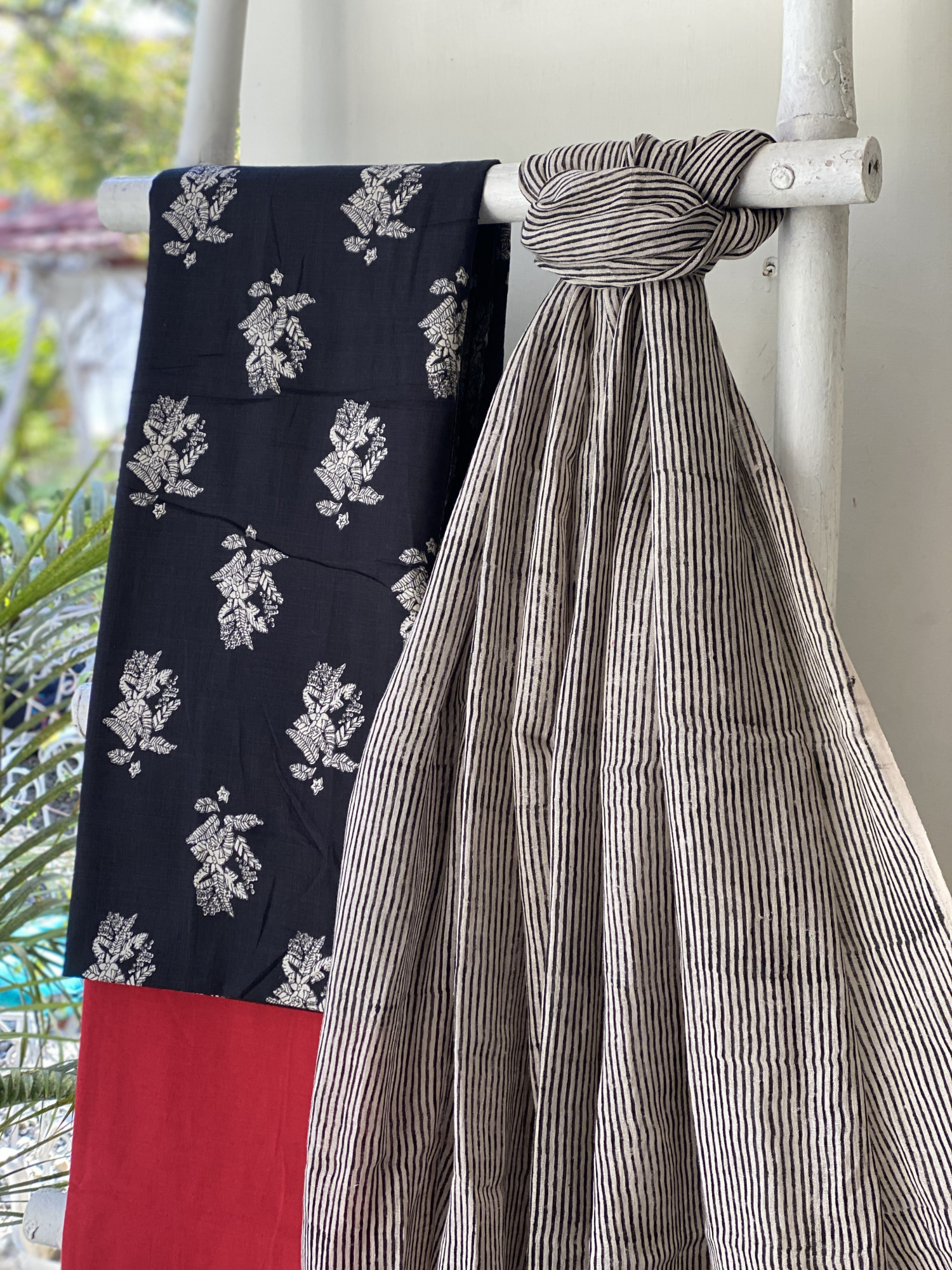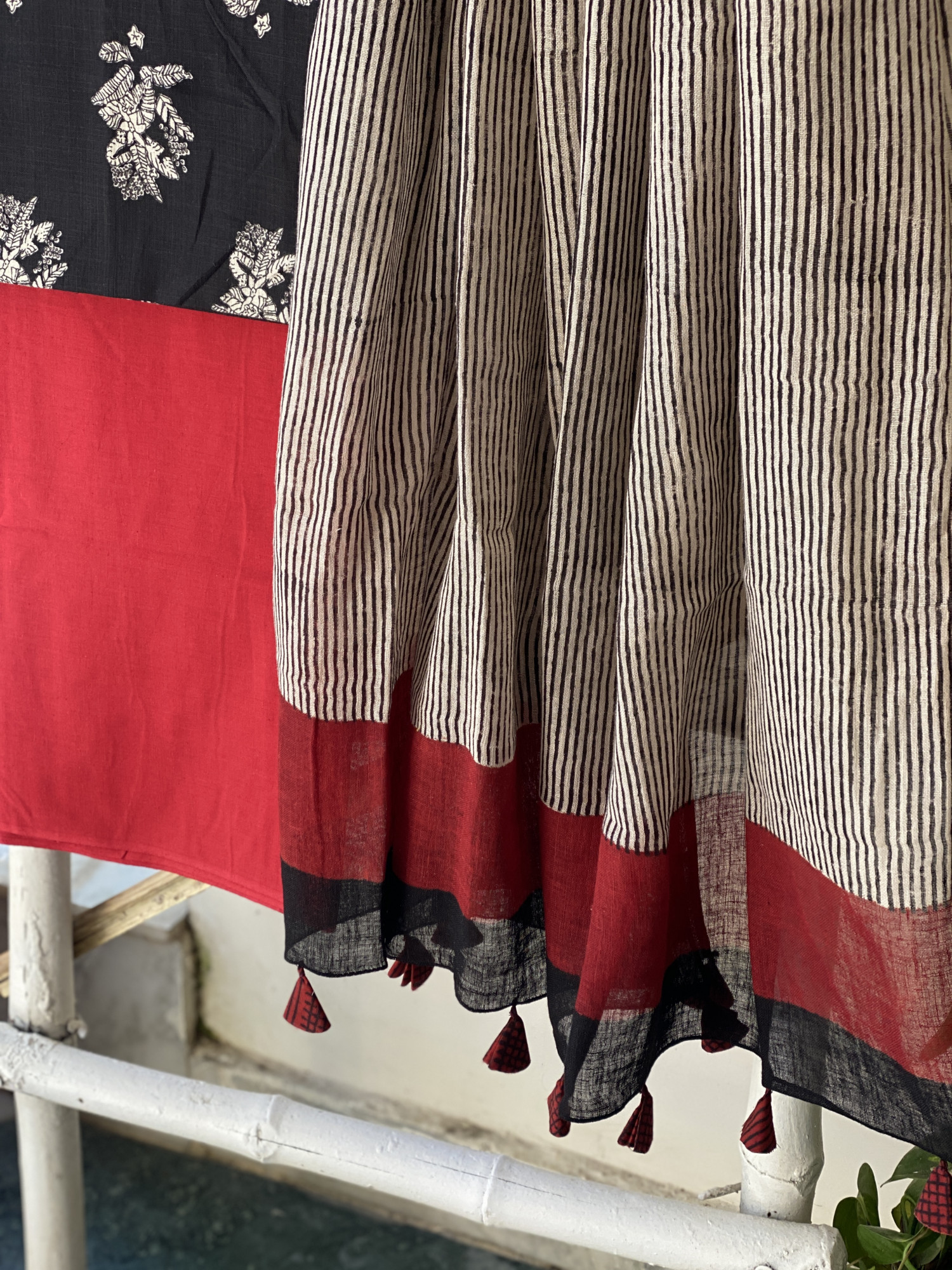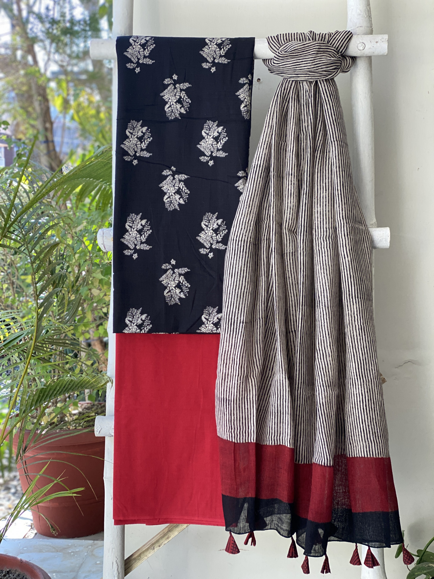 BLACK HAND BLOCK PRINT COTTON SHIRT AND A RED PLAIN COTTON BOTTOM, PAIRED WITH A BEIGE GEOMETRIC PATTERN HAND BLOCK PRINTED COTTON LINEN DUPATTA.