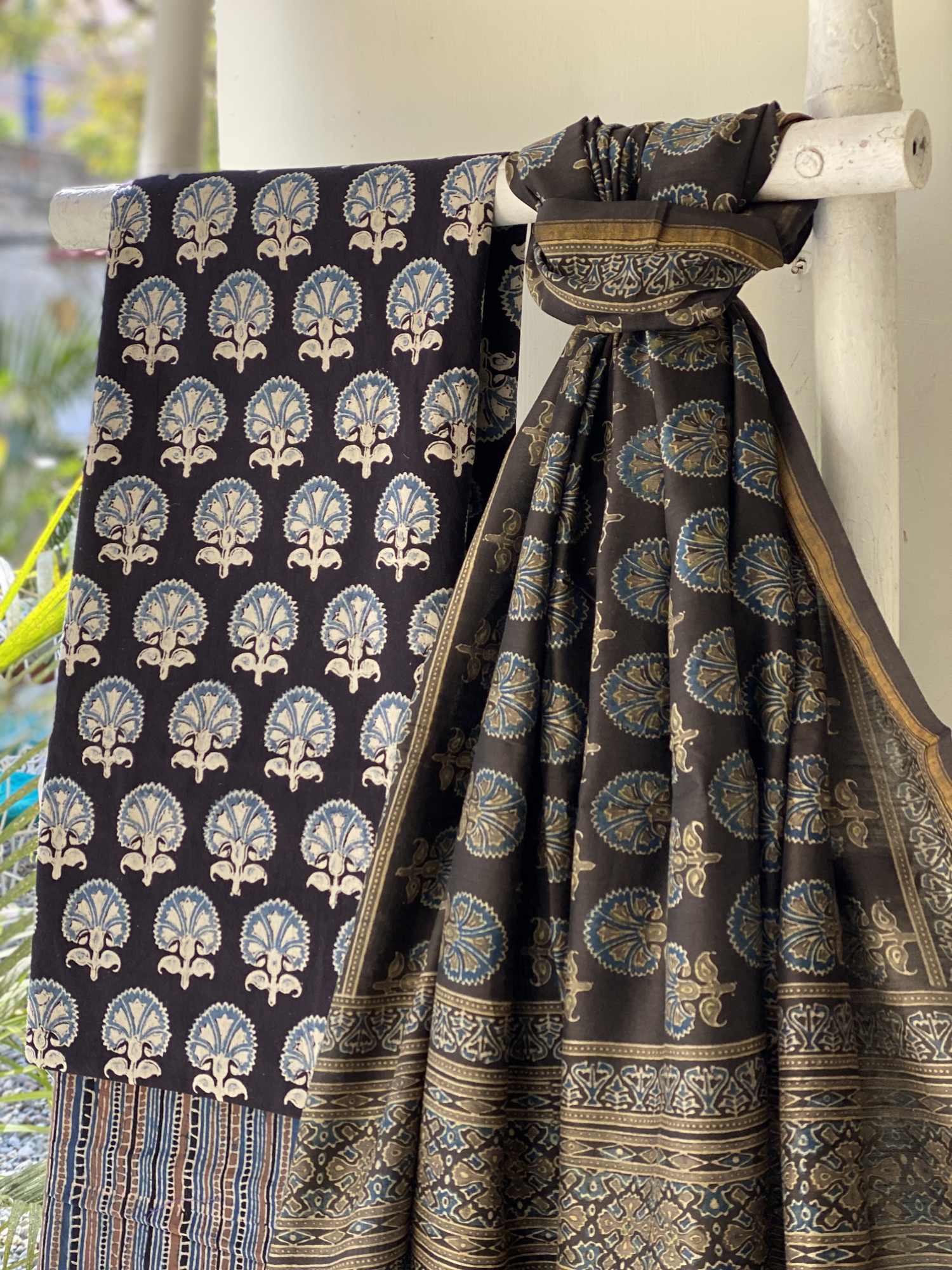 BLACK AJRAKH HAND BLOCK PRINT COTTON SHIRT AND A MULTI COLOUR BLOCK PRINTED COTTON BOTTOM PAIRED WITH A BLACK AJRAKH HAND BLOCK PRINT CHANDERI SILK AND COTTON DUPATTA WITH ZARI BORDERS, ACCESSORISED WITH TASSLES.