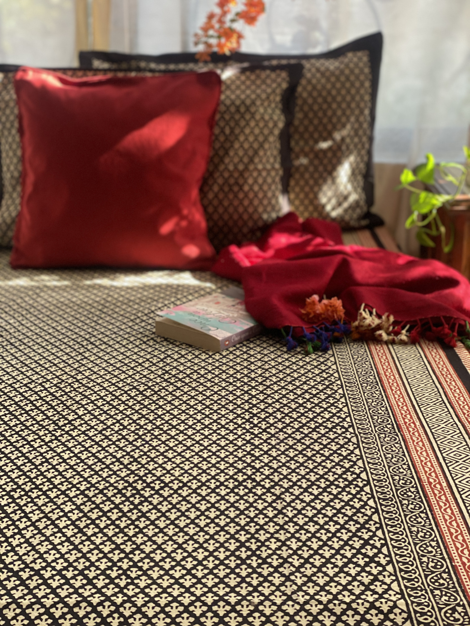 BLACK "BAGH" HAND block print COTTON double bedsheet with A PAIR OF pillow covers