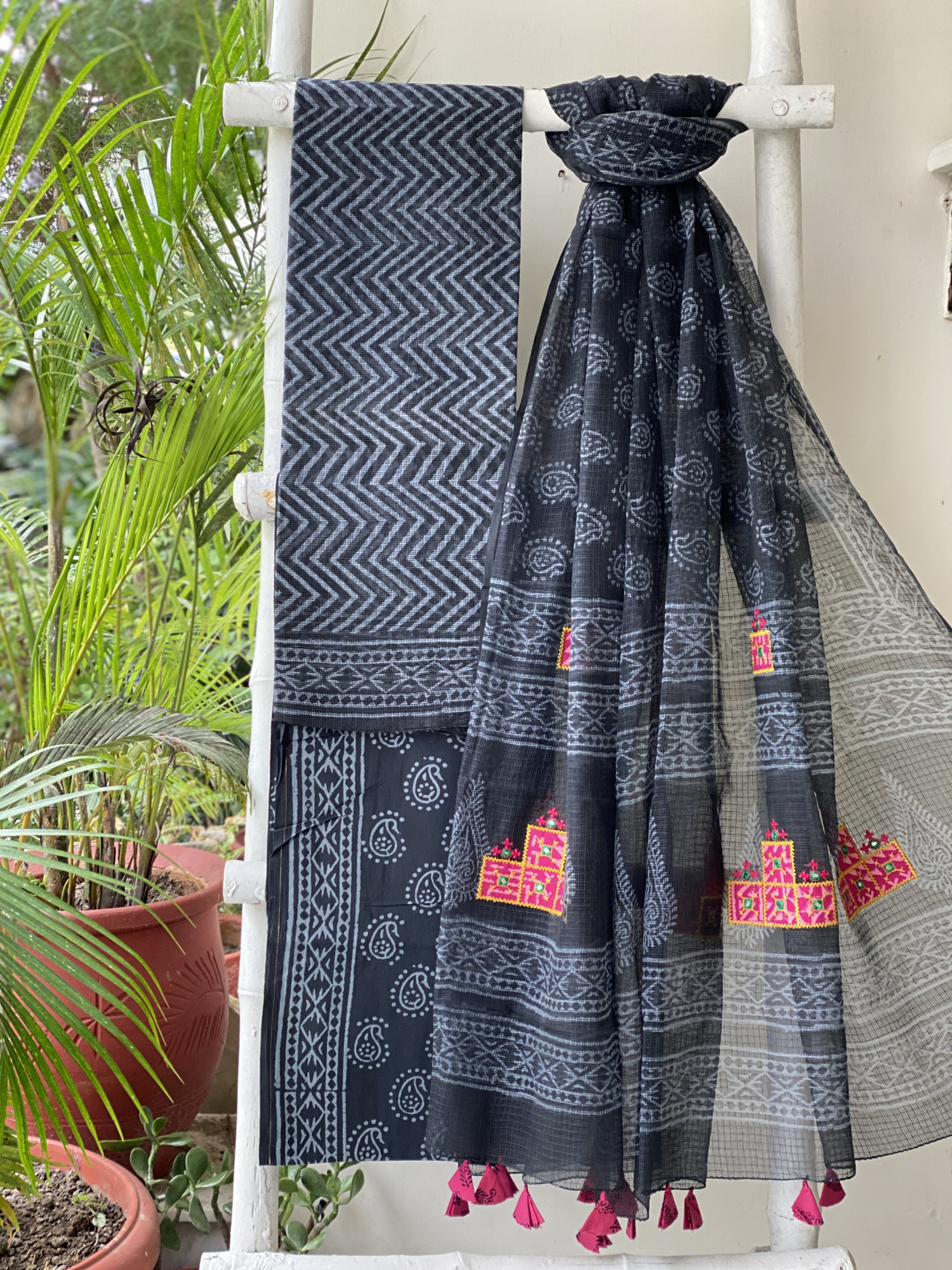 BLACK HAND BLOCK PRINT KOTA EMBROIDERED DUPATTA SET