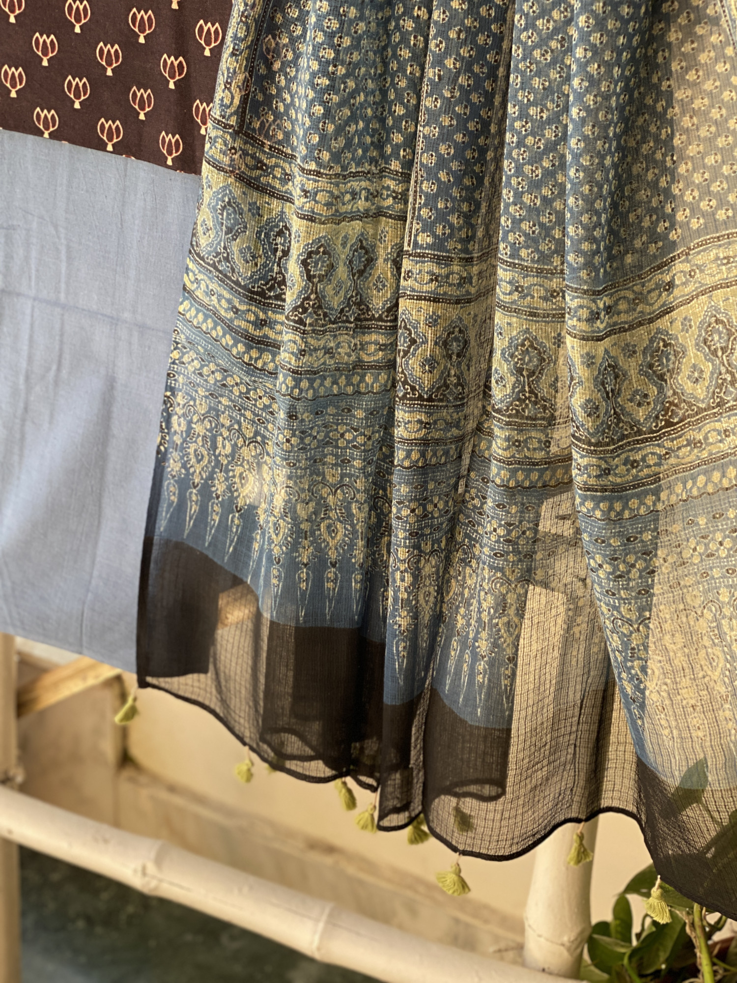 BLACK AJRAKH HAND BLOCK PRINT COTTON SHIRT AND INDIGO PLAIN COTTON BOTTOM, PAIRED WITH AN INDIGO AJRAKH KOTA DUPATTA, ACCESSORISED WITH TASSLES.