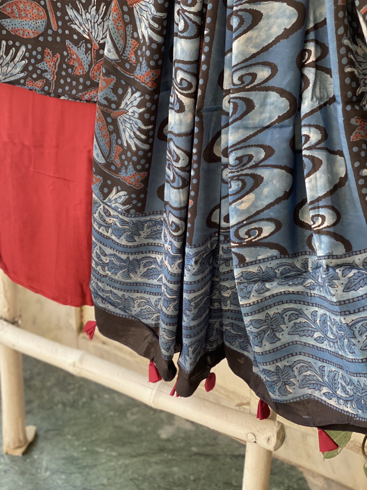 BLACK hand dyed ajrakh block print modal silk shirt and RED MODAL SILK PLAIN BOTTOM paired with A BLACK INDIGO modal silk ajrakh block print dupatta, accessorised with tassles.