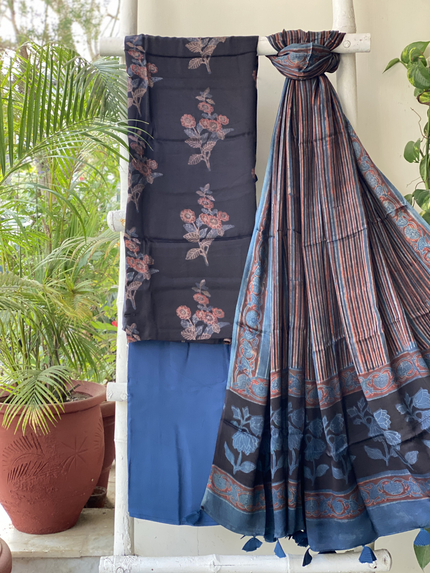 BLACK hand dyed ajrakh block print modal silk shirt and INDIGO MODAL SILK PLAIN BOTTOM paired with A INDIGO modal silk ajrakh block print dupatta, accessorised with tassles.
