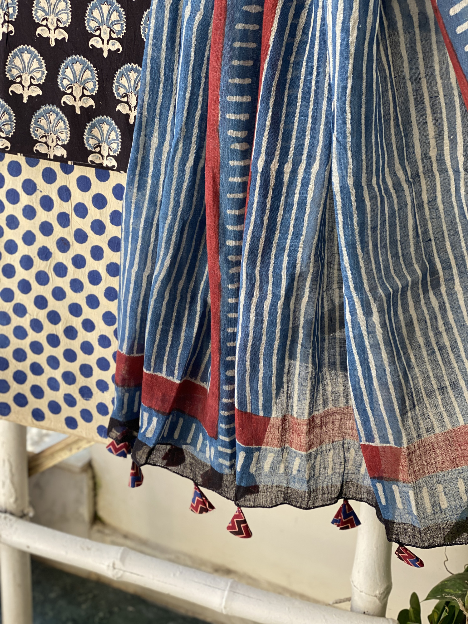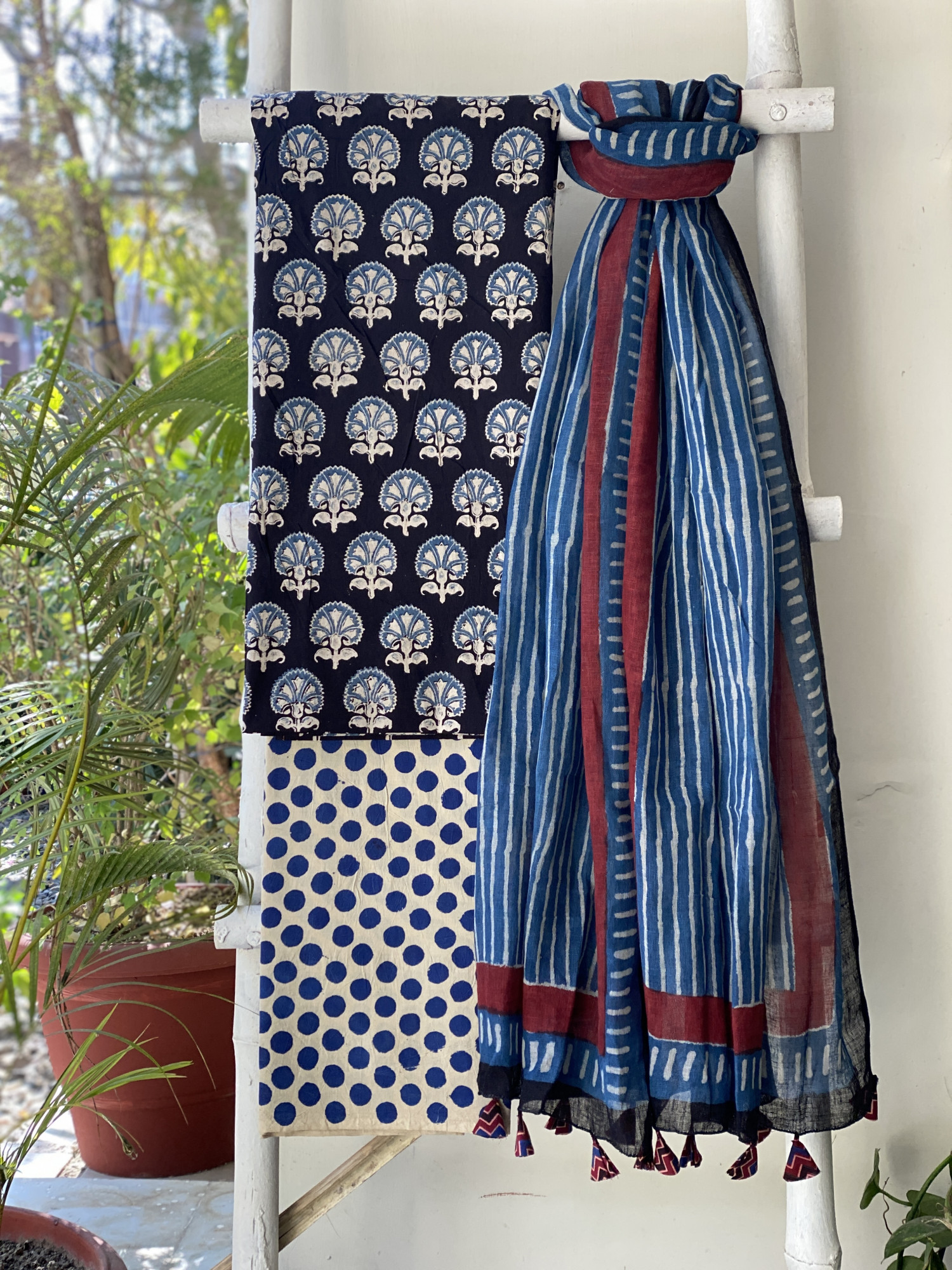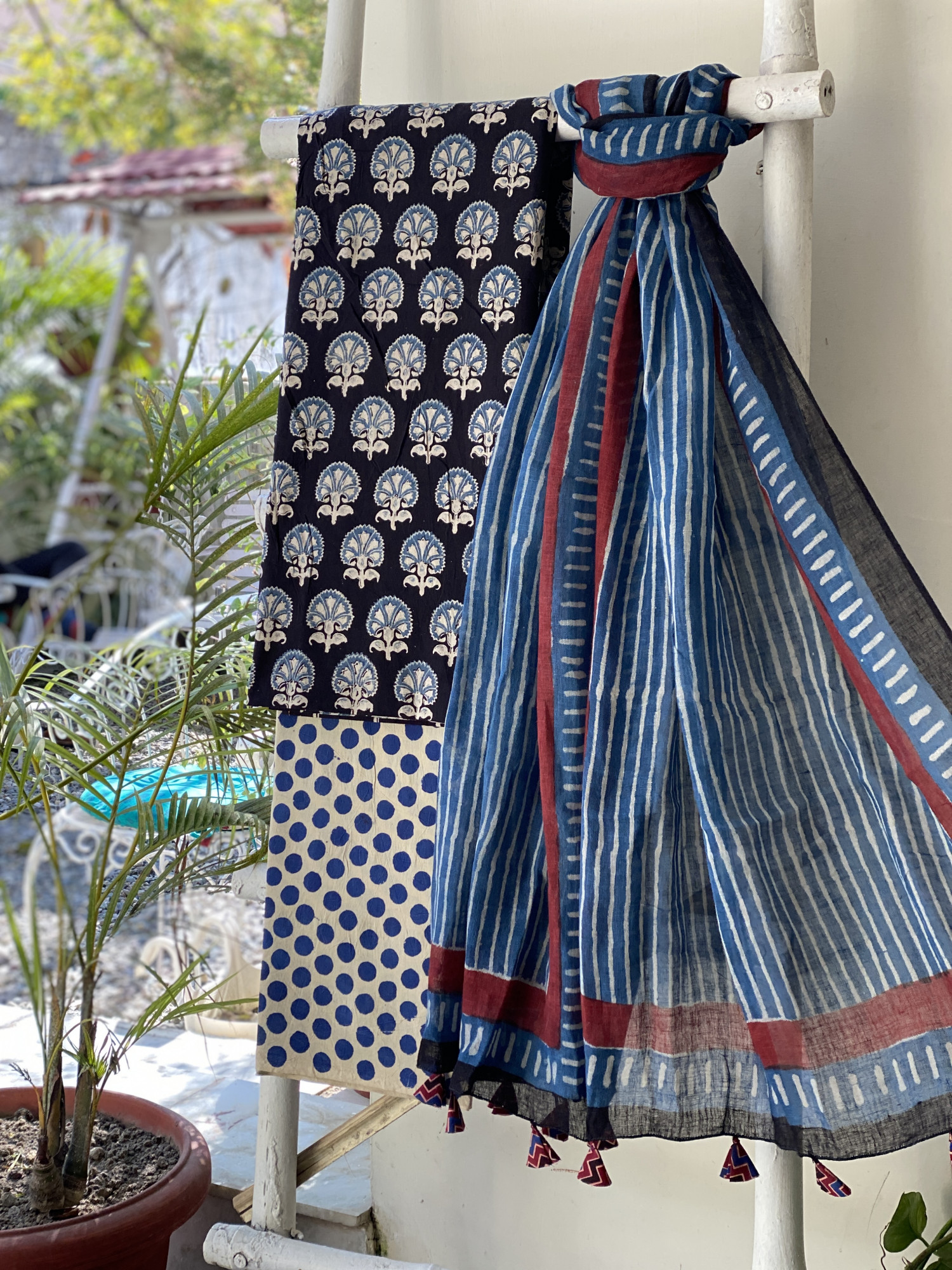 BLACK AJRAKH HAND BLOCK PRINT COTTON SHIRT AND A BEIGE-BLACK HAND BLOCK PRINTED COTTON BOTTOM, PAIRED WITH AN INDIGO GEOMETRIC PATTERN HAND BLOCK PRINTED COTTON LINEN DUPATTA.