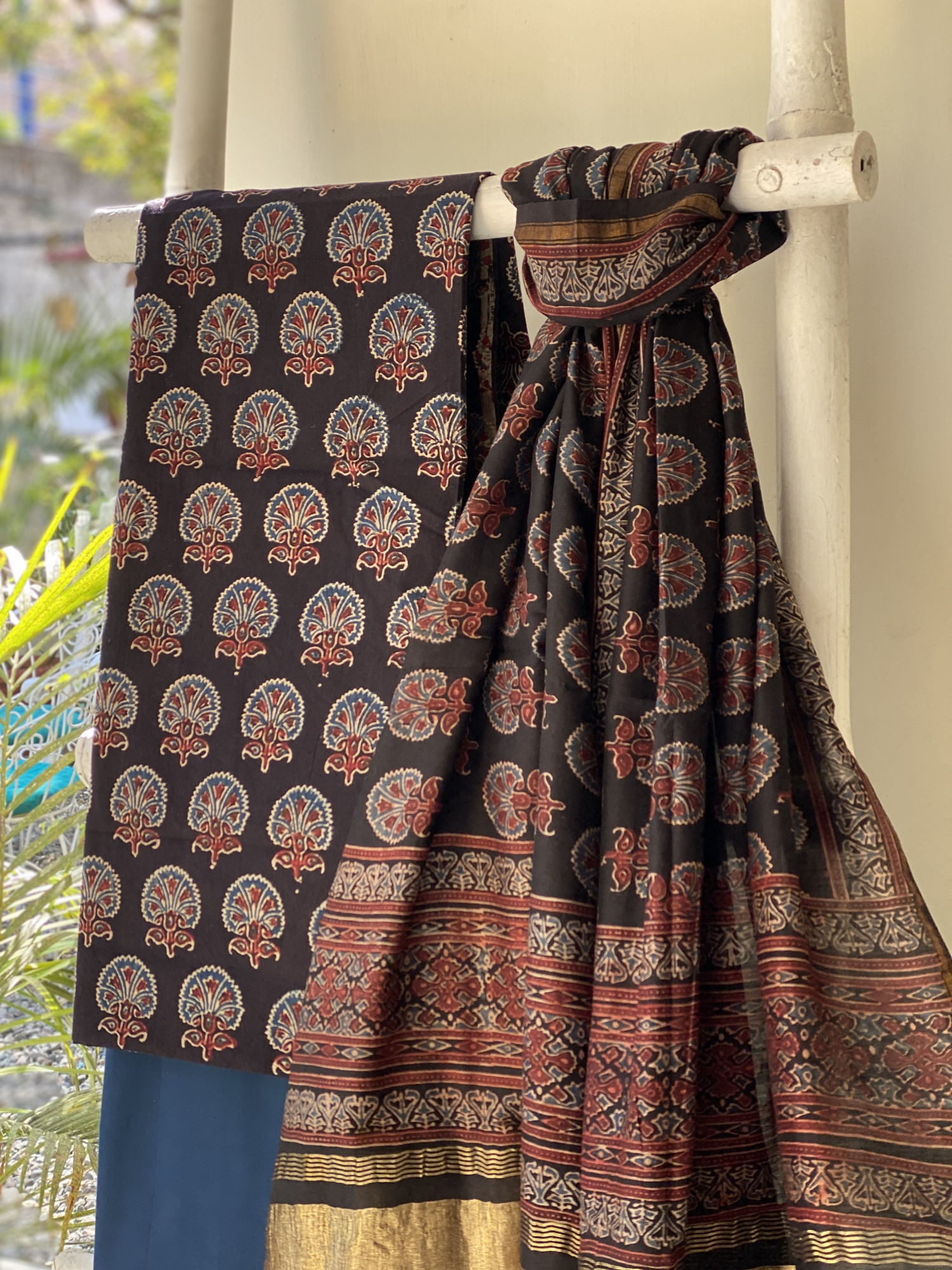 BLACK AJRAKH HAND BLOCK PRINT COTTON SHIRT AND AN INDIGO PLAIN COTTON BOTTOM PAIRED WITH A BLACK AJRAKH HAND BLOCK PRINT CHANDERI SILK AND COTTON DUPATTA WITH ZARI BORDERS, ACCESSORISED WITH TASSLES.