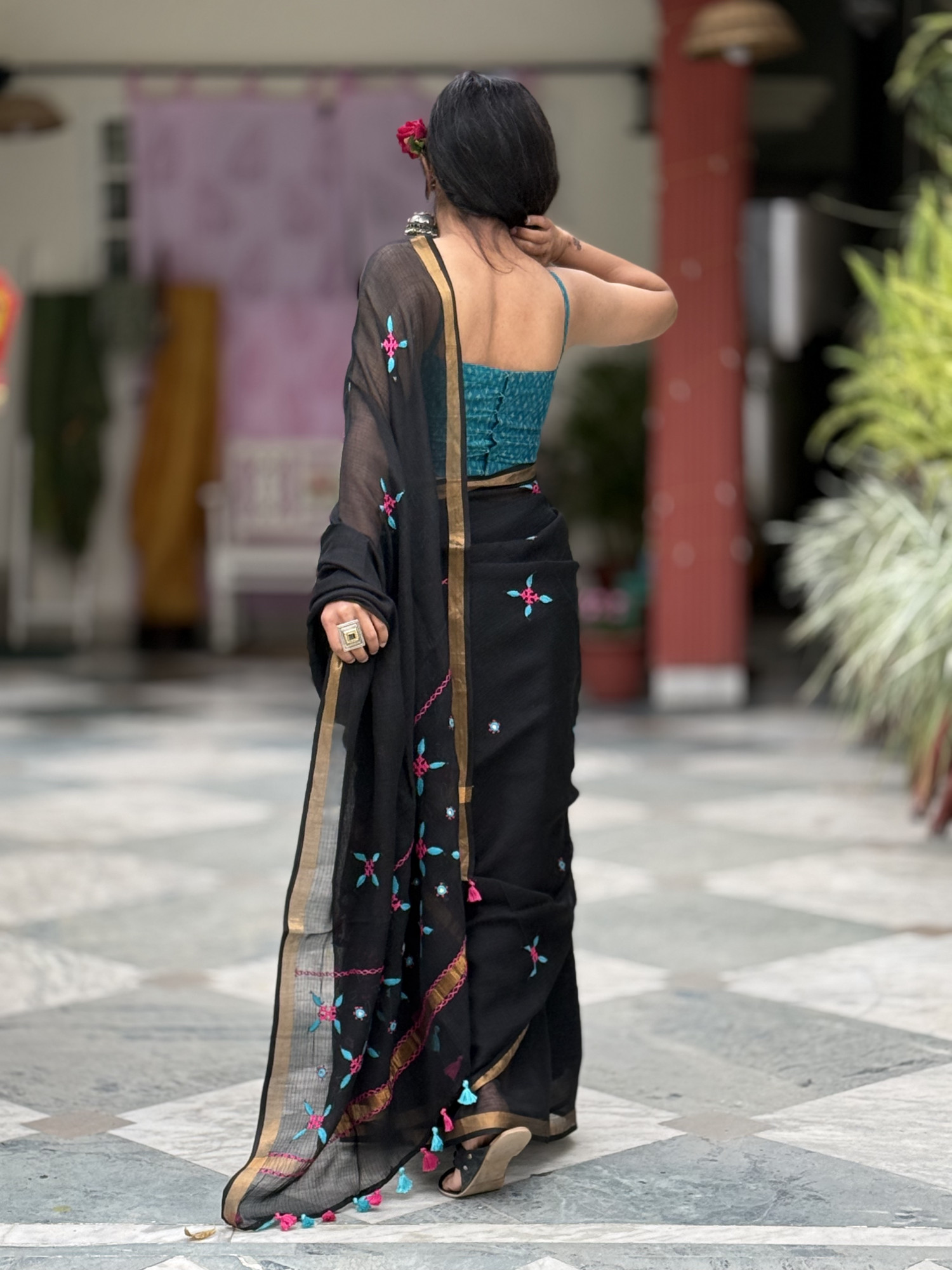 BLACK Kota cotton hand embroidered sari, with a zari woven border, accessorised with tassels.