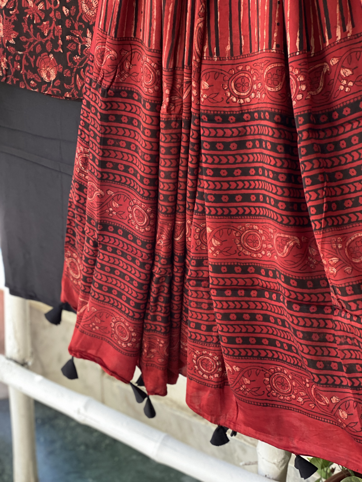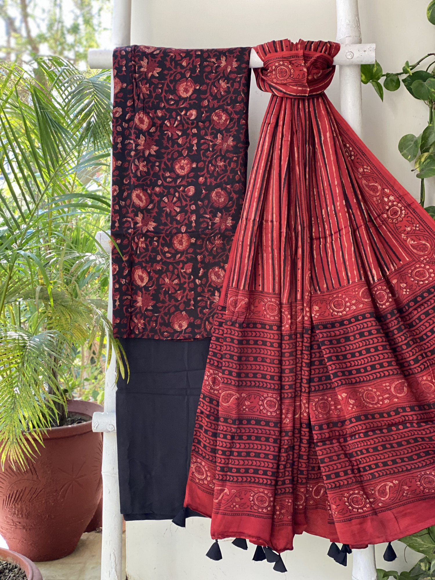 BLACK-MAROON hand dyed ajrakh block print modal silk shirt and BLACK MODAL SILK PLAIN BOTTOM paired with A MAROON-BLACK modal silk ajrakh block print dupatta, accessorised with tassles.