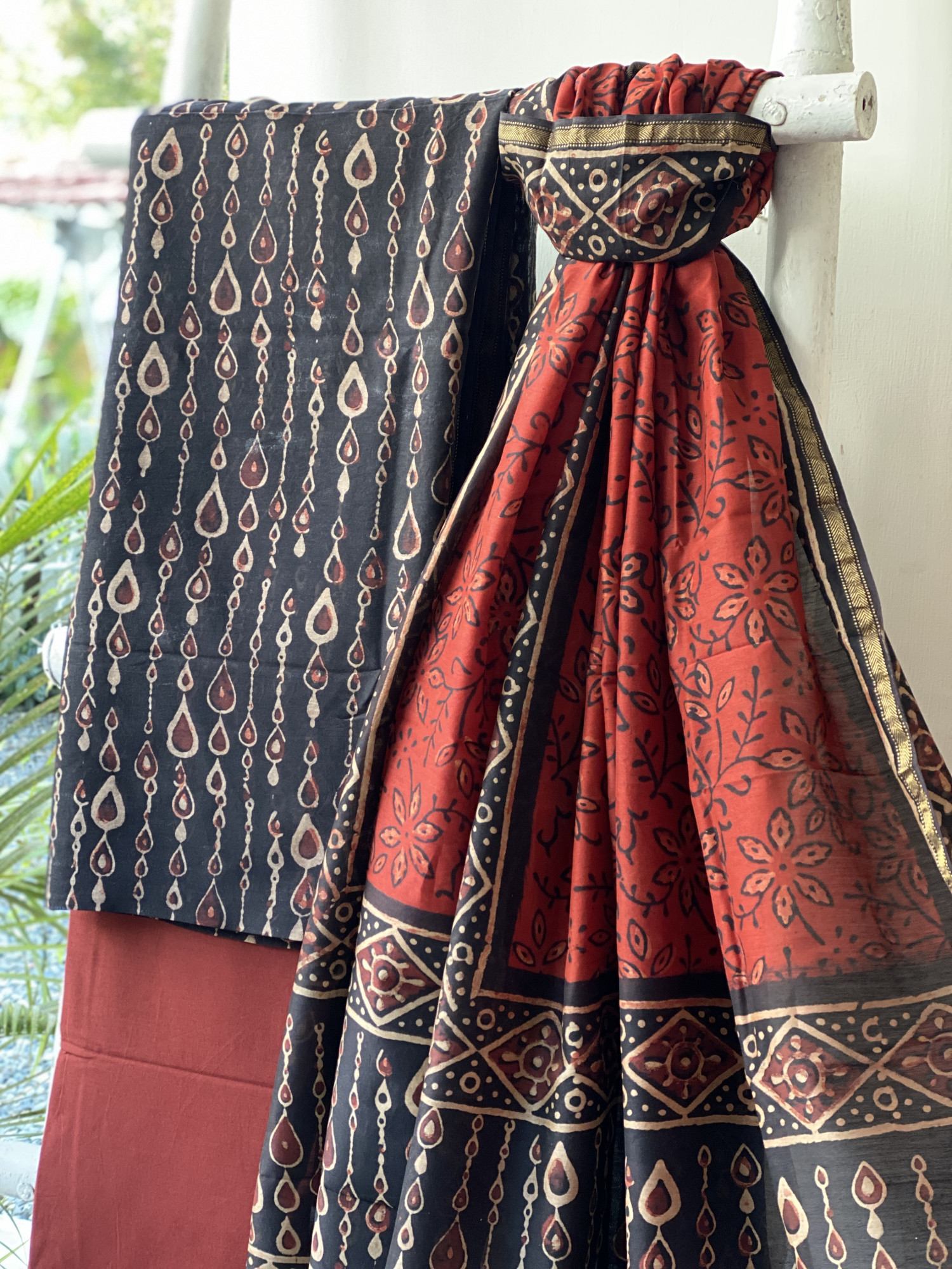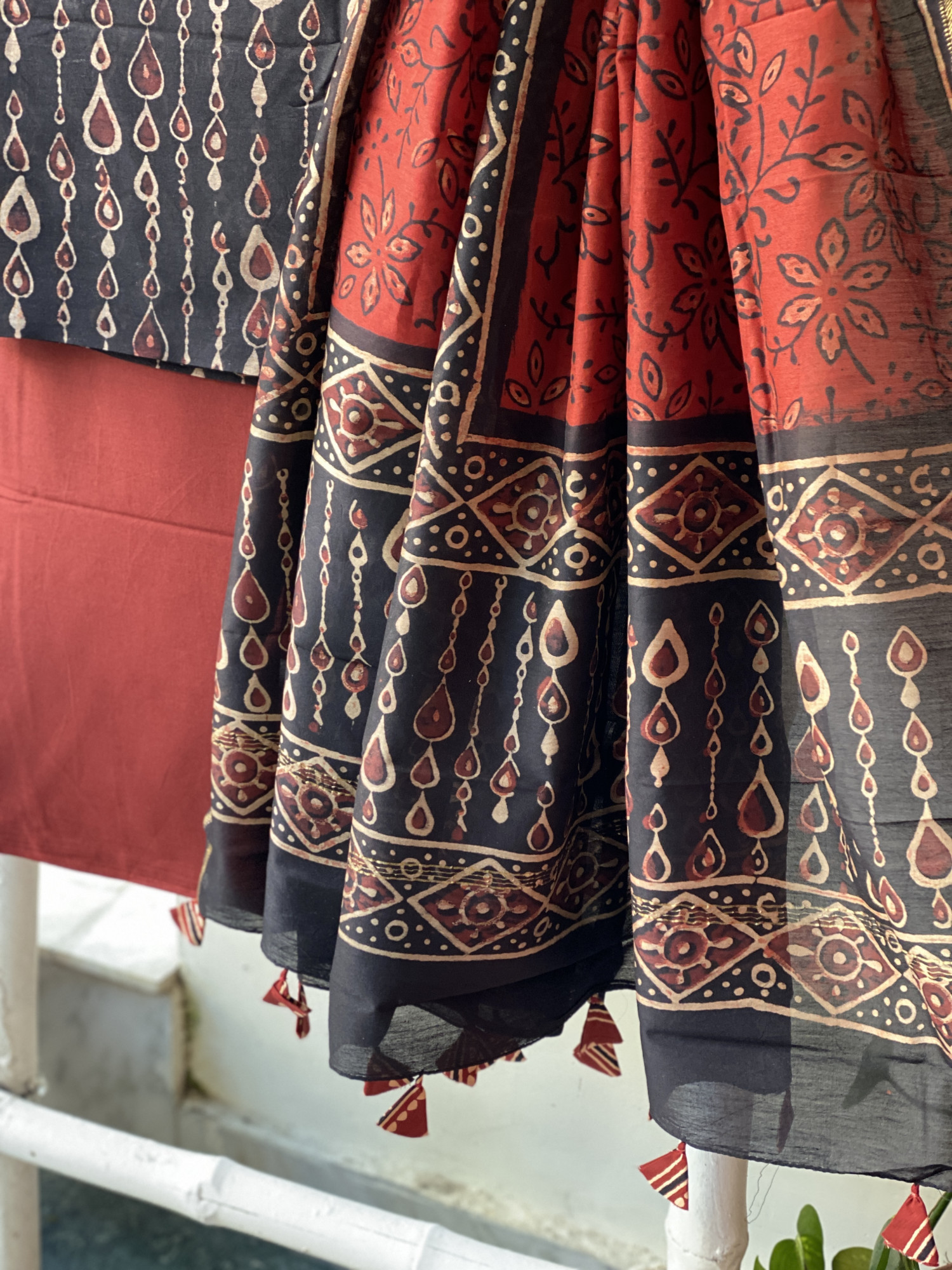 BLACK-MAROON HAND BLOCK PRINT CHANDERI SILK & COTTON DUPATTA SET