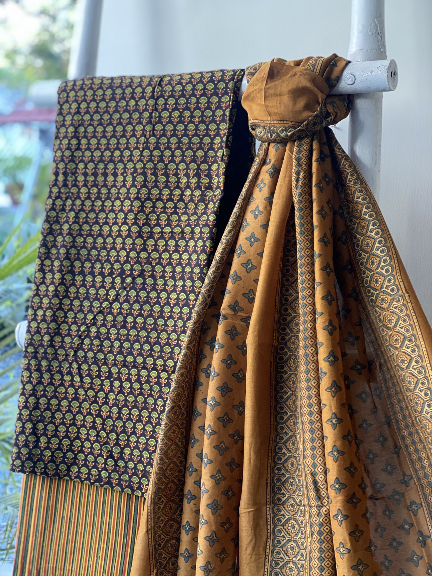 BLACK AJRAKH HAND BLOCK PRINT COTTON SHIRT AND A MULTI COLOUR STRIPED AJRAKH HAND BLOCK PRINT COTTON BOTTOM PAIRED WITH A MUSTARD AJRAKH HAND BLOCK PRINT CHANDERI SILK AND COTTON DUPATTA, ACCESSORISED WITH TASSLES.