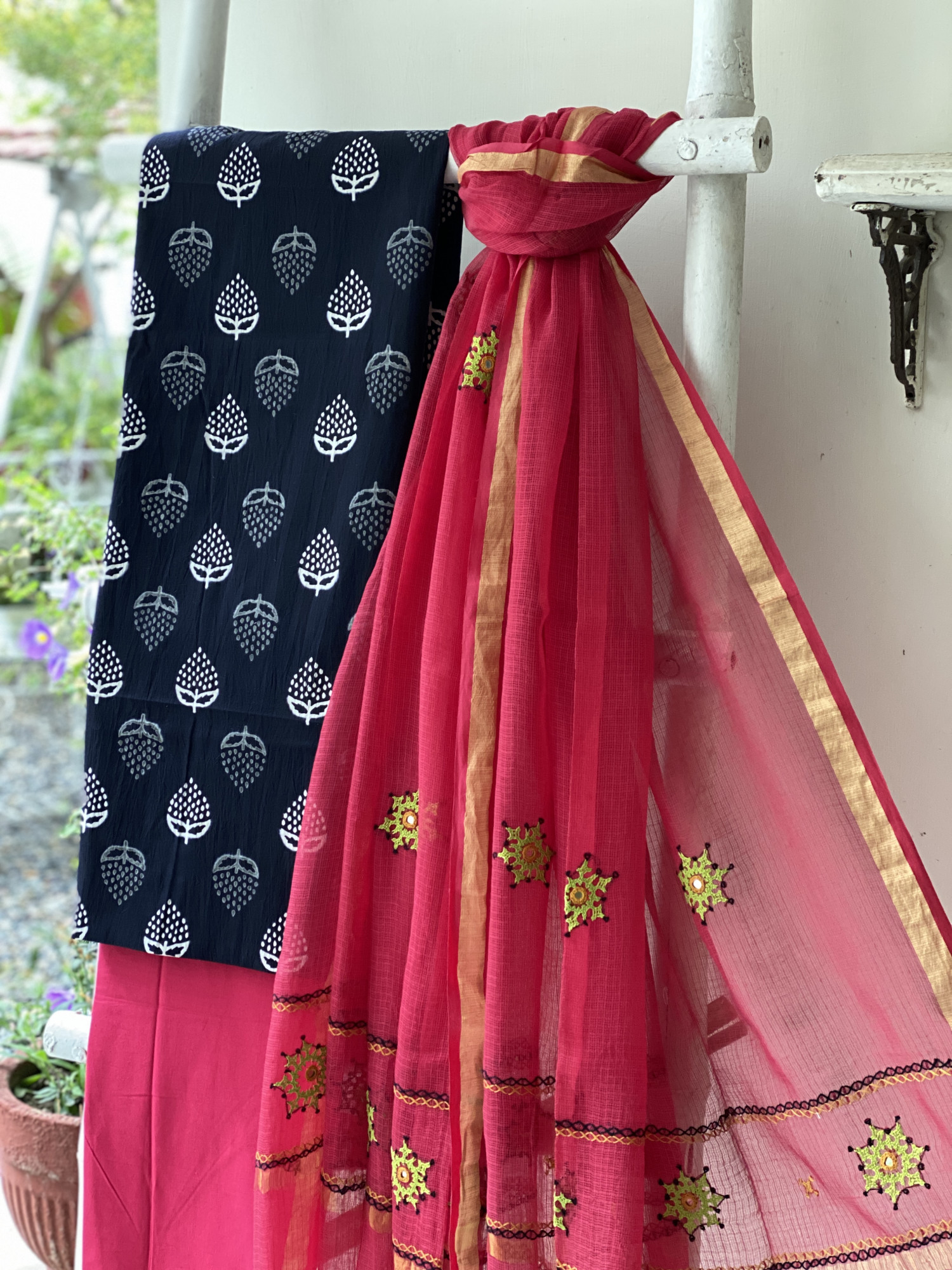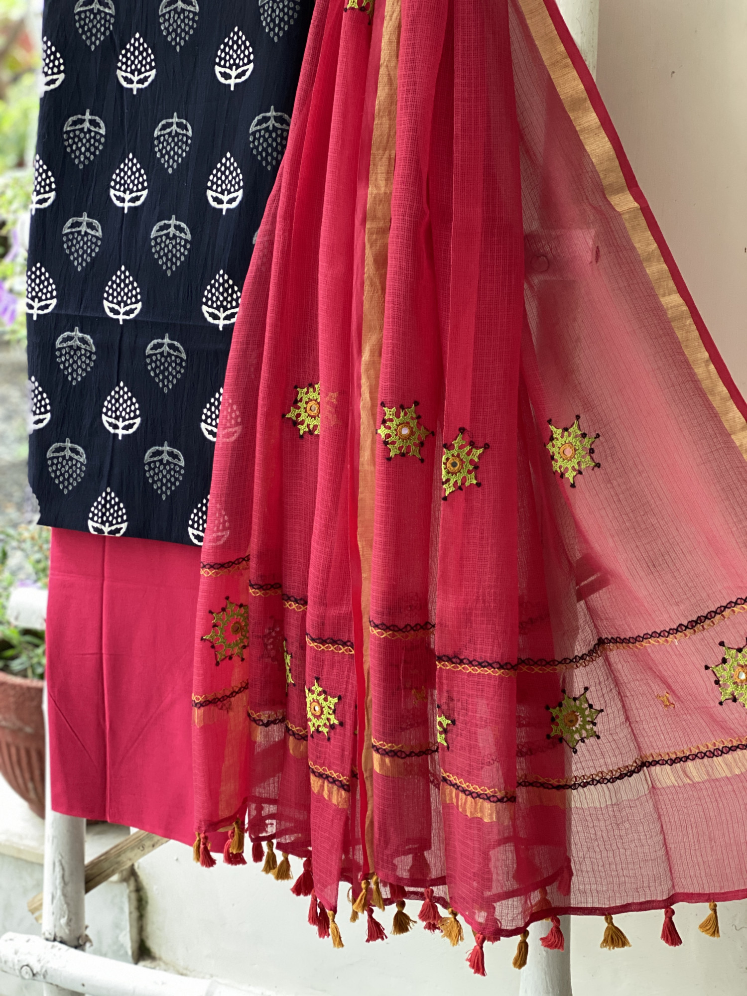 BLACK HAND BLOCK PRINT COTTON SHIRT AND A ROSE PLAIN COTTON BOTTOM PAIRED WITH A ROSE KOTA HAND EMBROIDERED DUPATTA WITH ZARI WOVEN BORDER, ACCESSORISED WITH TASSLES.