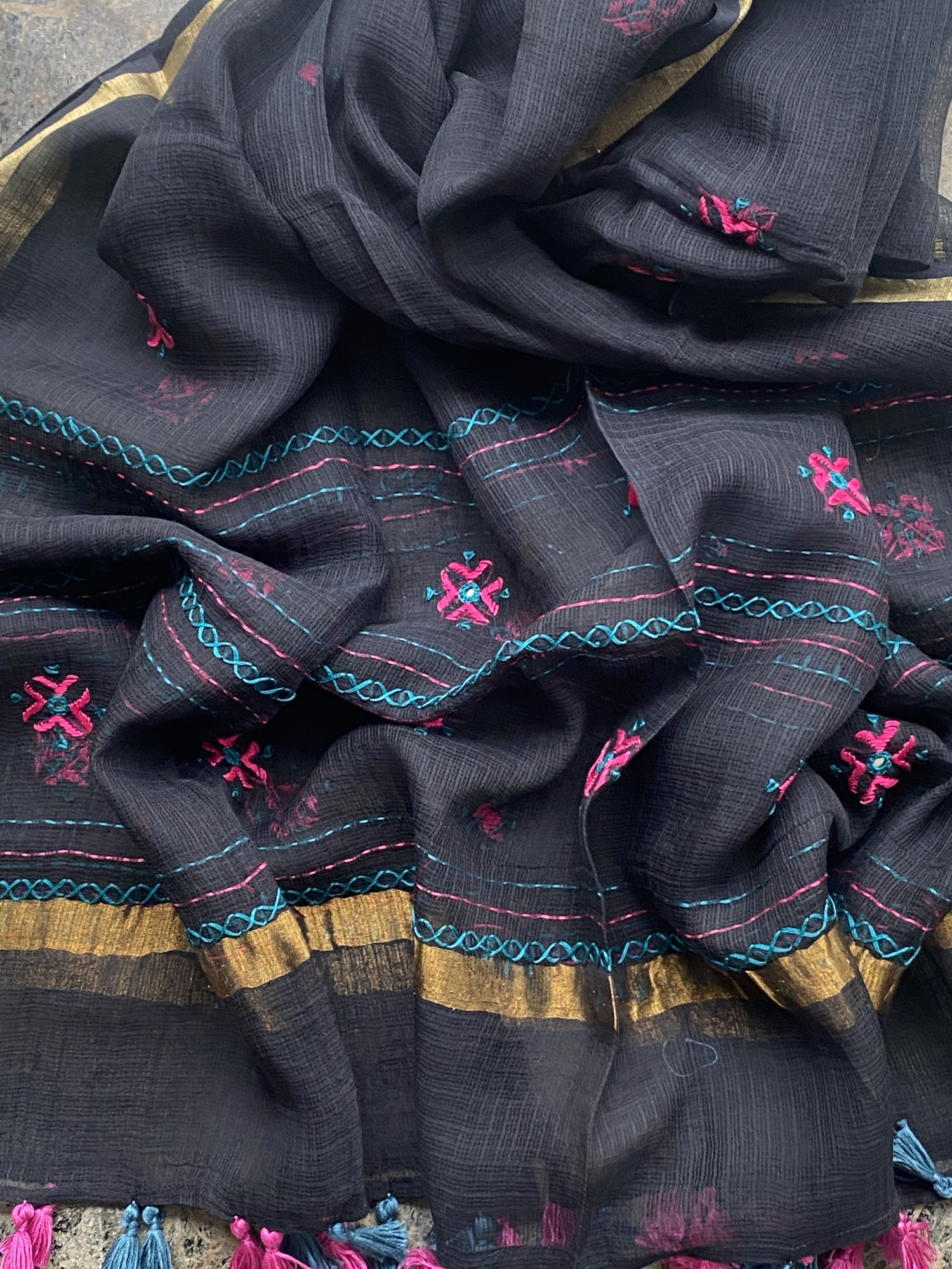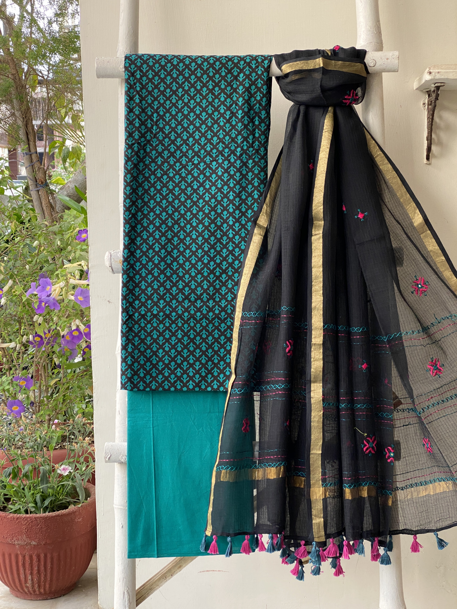 BLACK-TEAL HAND BLOCK PRINT COTTON SHIRT AND A TEAL PLAIN COTTON BOTTOM PAIRED WITH A BLACK KOTA HAND EMBROIDERED DUPATTA WITH ZARI WOVEN BORDER, ACCESSORISED WITH TASSLES.