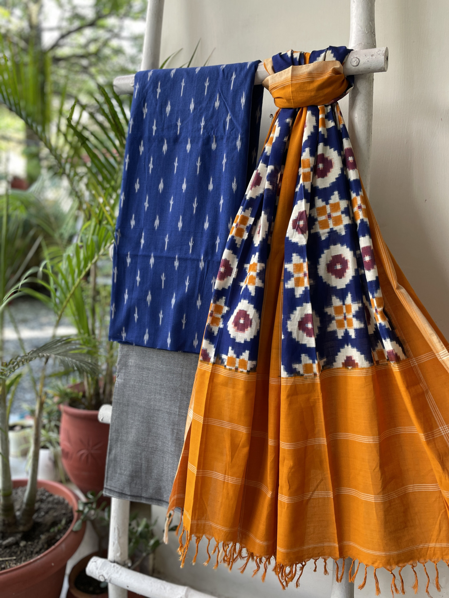 BLUE COTTON WOVEN IKKAT SHIRT WITH GREY COTTON BOTTOM paired with aN INDIGO & MUSTARD IKKAT TELIA COTTON WOVEN dupatta