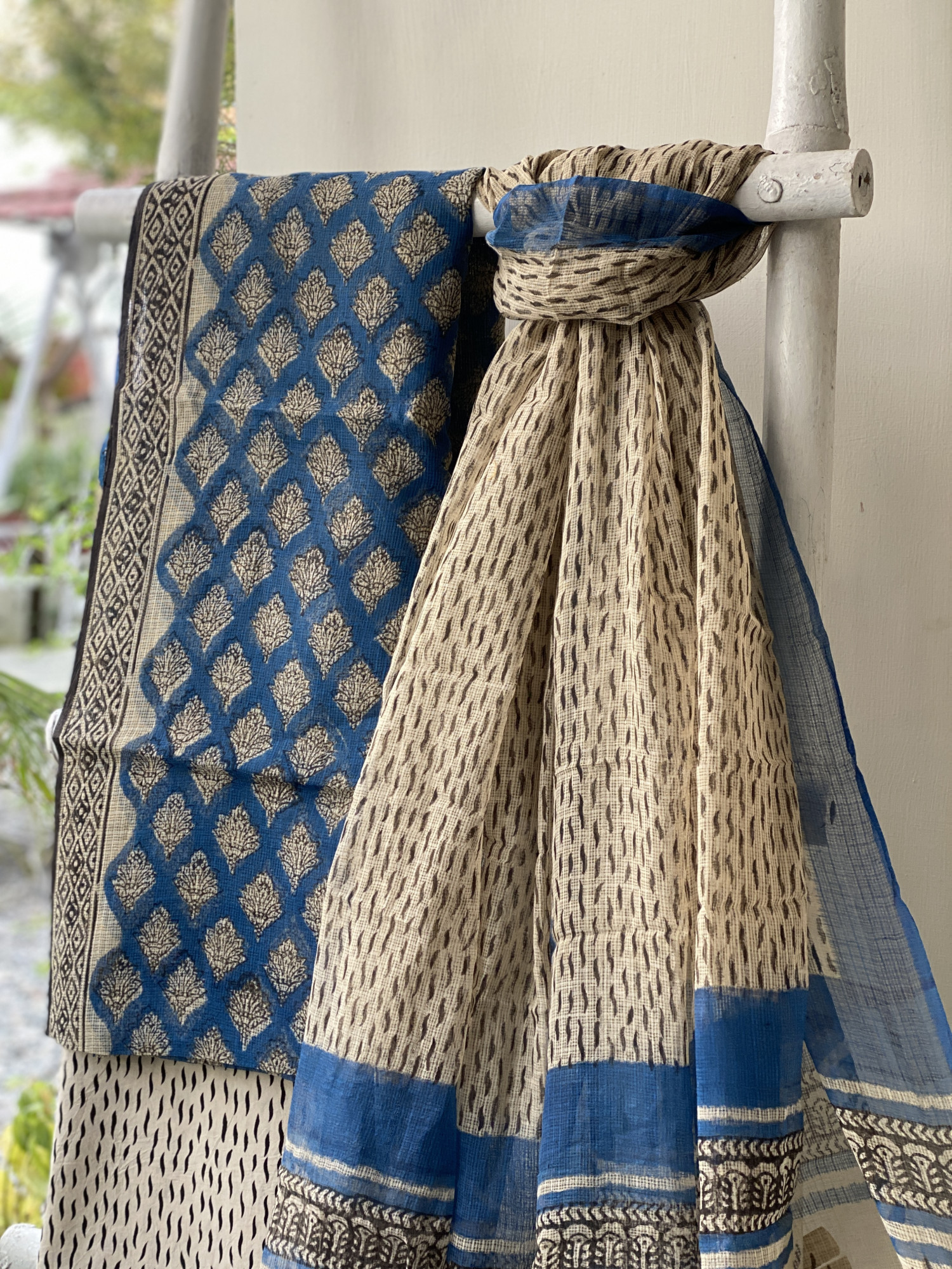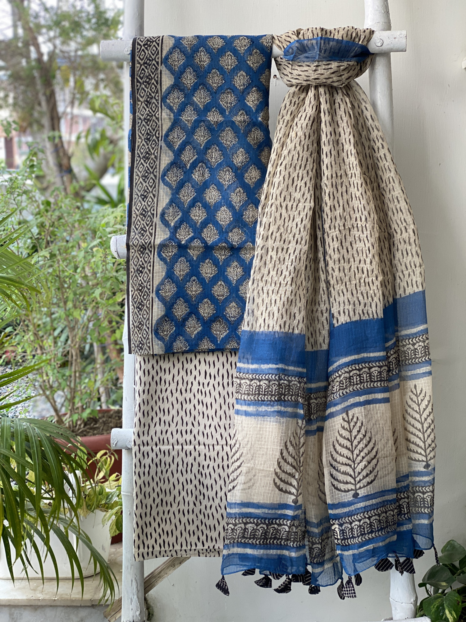 BLUE HAND BLOCK "BAGH" PRINT KOTA SHIRT (COMES WITH A MATCHING COTTON LINING PIECE) AND BEIGE COTTON BLOCK PRINT BOTTOM PAIRED WITH BEIGE-BLUE KOTA BLOCK PRINT DUPATTA, ACCESSORISED WITH TASSLES.